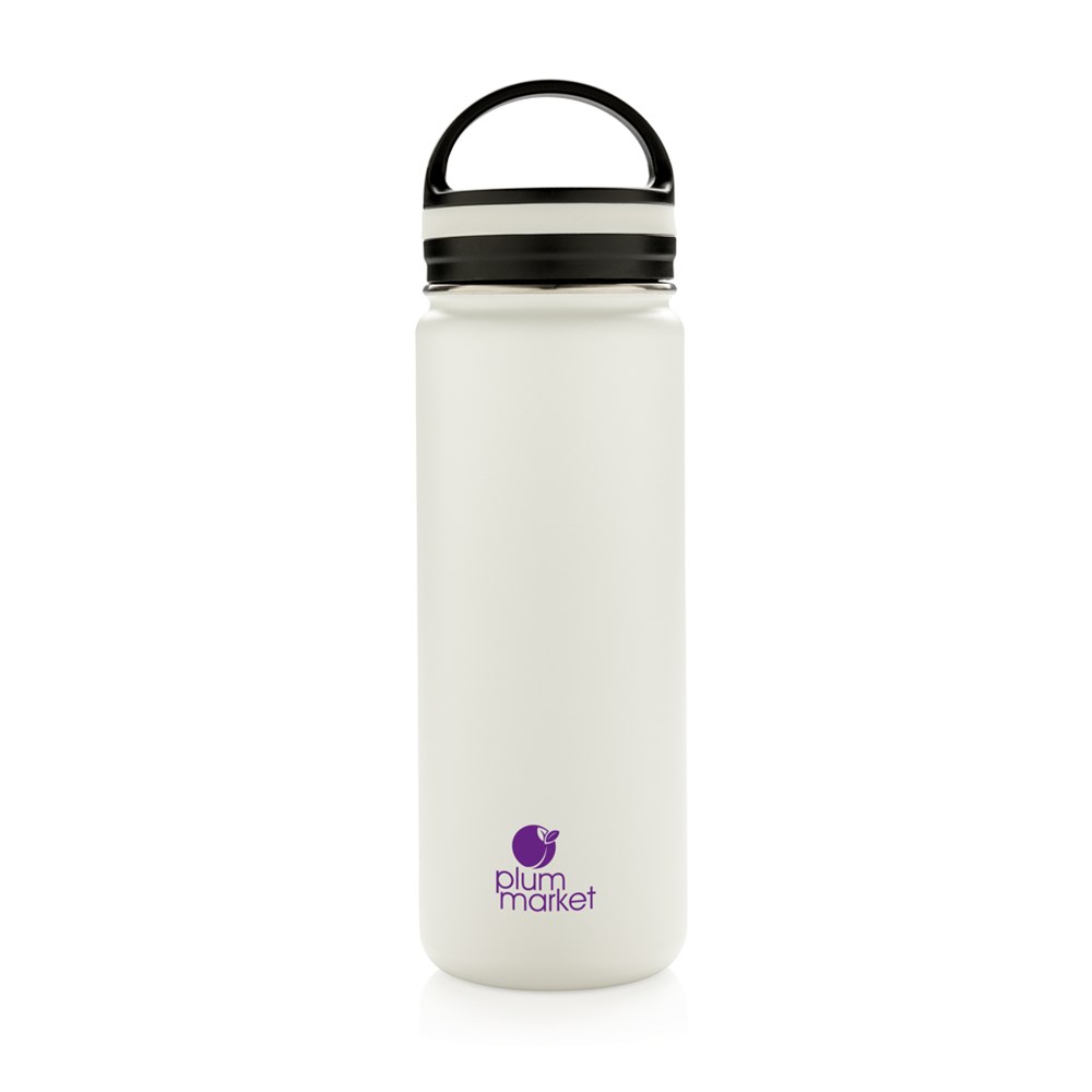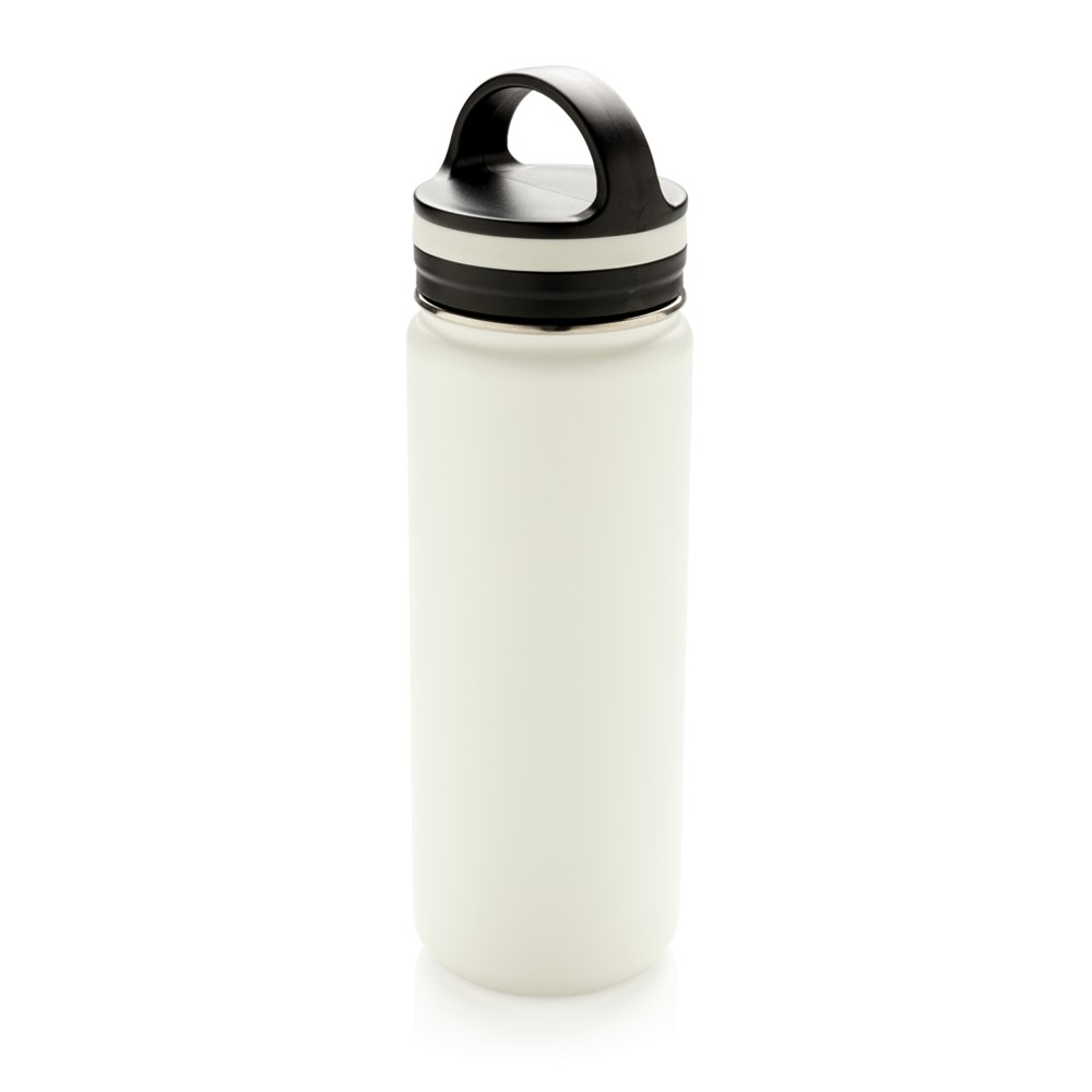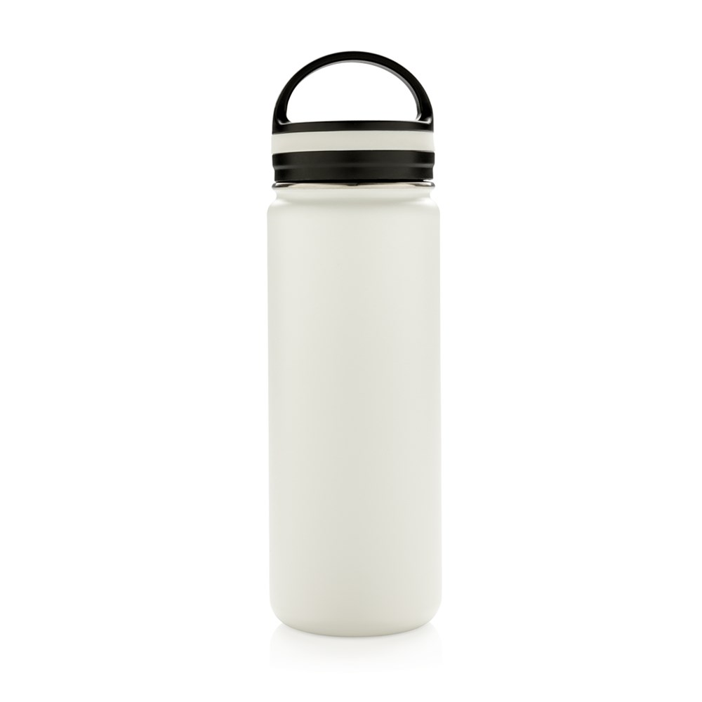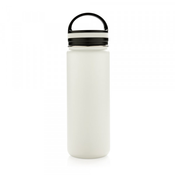 Doppelwandig isolierte Vakuumflasche mit schwarzem Griff. Die Flasche verfügt über eine große Trinköffnung für einfachstes Befüllen und Reinigen. Die Trinkflasche ist somit perfekt für lange Wanderungen, Strandtage oder den täglichen Büroalltag. 304 SS innen und 201 SS aussen hält Ihre Getränke für bis zu 5h warm und 15h kalt. Die weiß-graue ist PMS Cool Gray 1. Inhalt: 500ml. Nur Handwäsche.