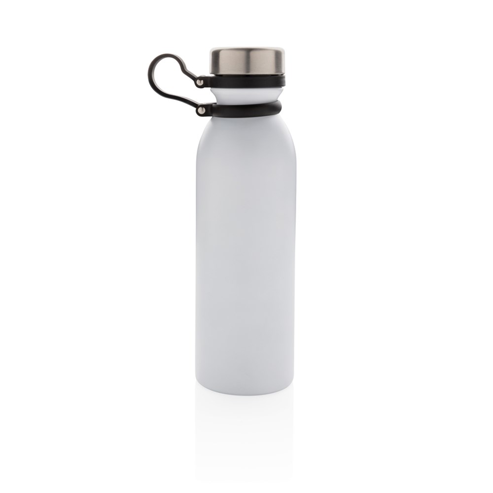 Diese doppelwandige Kupfer-Vakuumisolierte Trinkflasche hält Ihre Getränke bis zu 8h warm und bis zu 24h kalt. Der schwarze Trageriemen aus Silikon ist ebenso am Deckel befestigt und muss somit beim Trinken nicht noch separat festgehalten werden. Die weiß-graue ist PMS Cool Gray 1. Inhalt: 600ml. Nur Handwäsche.