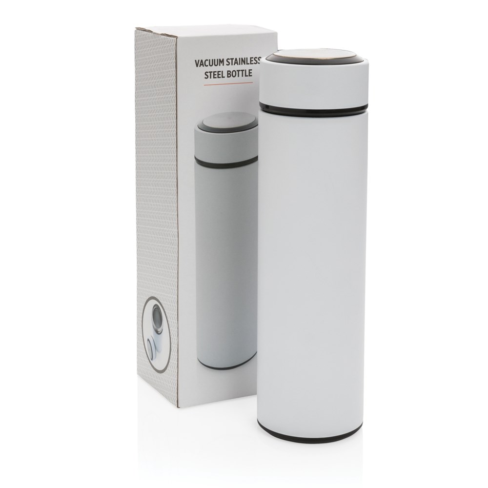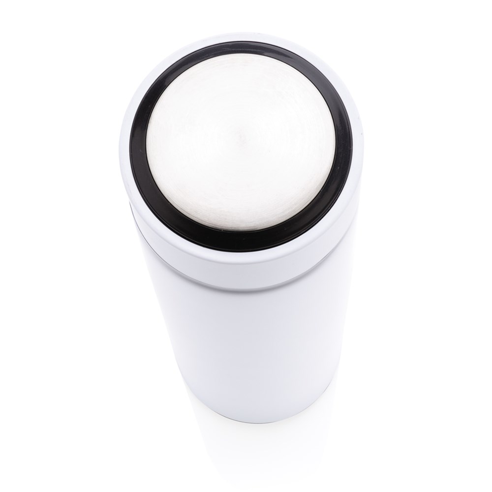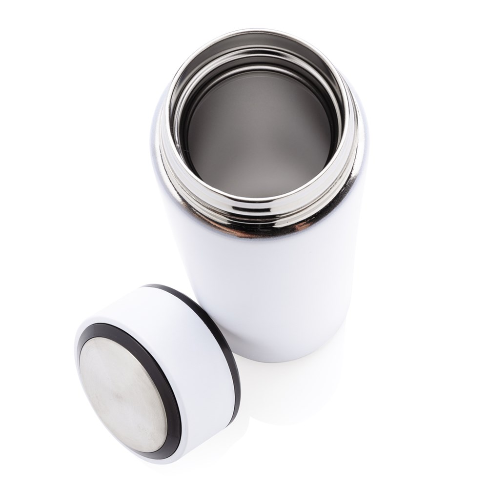 Halten Sie Ihren Kaffee oder Tee mit dieser Vakuum-Edelstahlflasche mit gebürstetem Metalldeckel schön warm. Die Flasche verfügt über einen auslaufsicheren Schraubdeckel und ermöglicht das Trinken von jeder Seite. Mit breiter Öffnung für eine einfache Reinigung. Kapazität 450ml. BPA-frei. Nur Handwäsche.