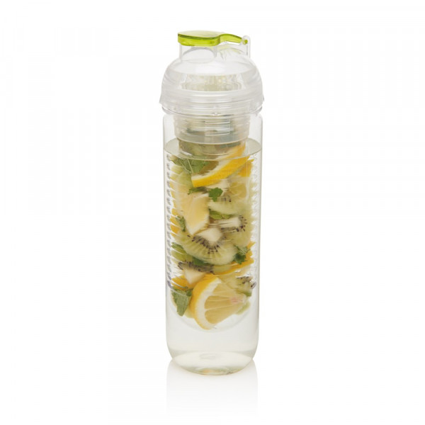 500ml Tritan Flasche mit Früchte-Aromafach. Bereichern Sie Ihr Wasser mit Vitaminen und einer Menge Geschmack durch das einfache Hinzufügen von frischen Früchten im Aromafach. Dieses Fach kann durch die Zugabe von Eiswürfeln auch als Kühlfach verwendet werden. Nur Handwäsche.