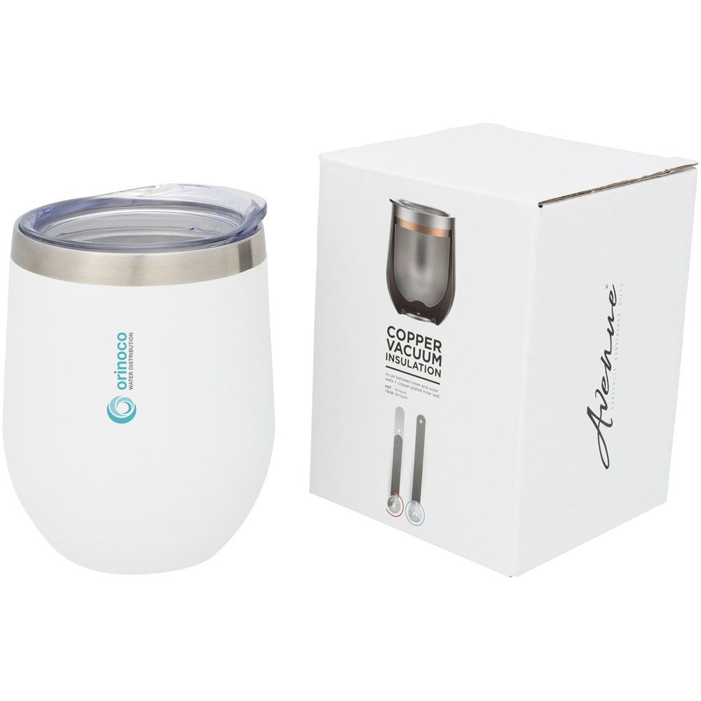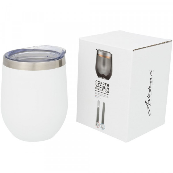 Der Corzo vakuumisolierter Kupfer Becher hat eine doppelwandige Vakuum-Konstruktion mit Kupfer-Isolierung, was bedeutet, dass er Getränke für 6 Stunden heiß und für 24 Stunden kalt hält. Die Konstruktion verhindert Kondenswasser auf der Außenseite des Bechers. Einfaches trinken, Deckel zum Andrücken. Mit Sprüh-Pulverbeschichtung auf der Außenseite. Eine breite Öffnung zum bequemen Befüllen und Ausgießen. Das Fassungsvermögen beträgt 350 ml. Präsentiert in einer Avenue Geschenkschachtel.