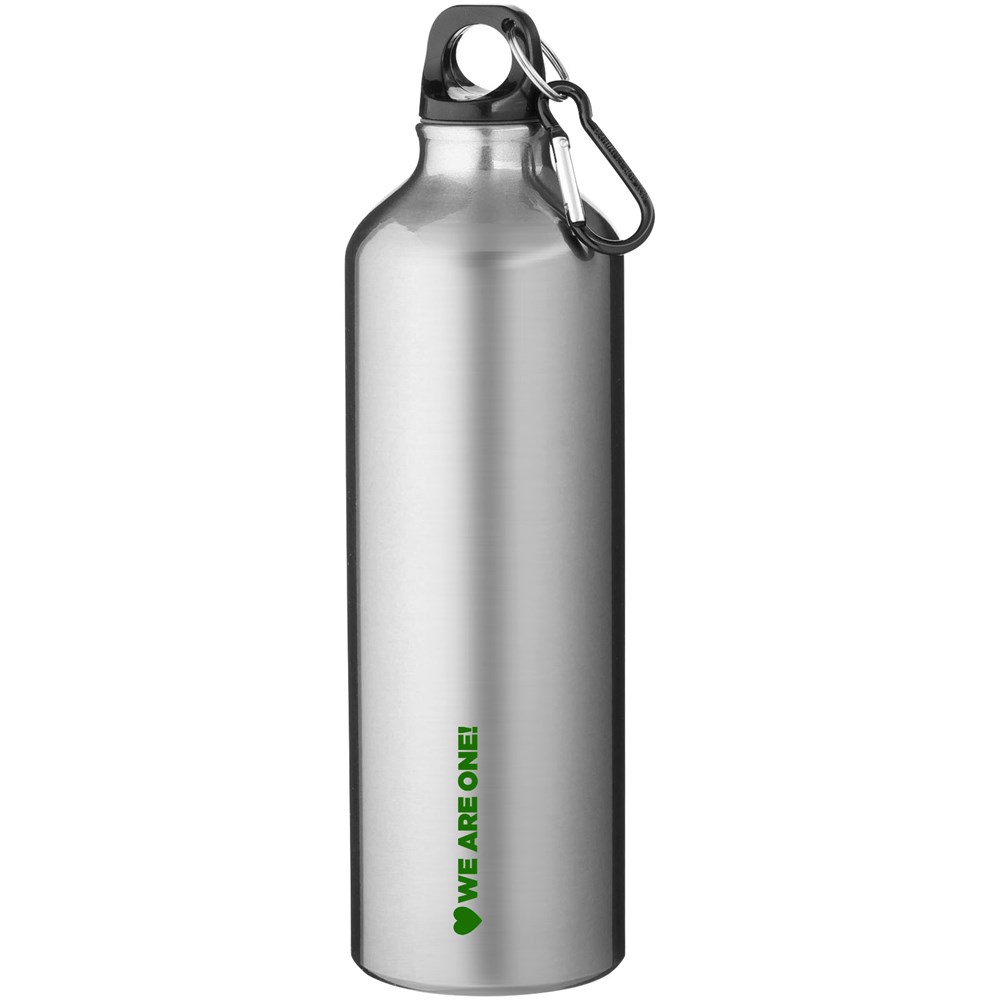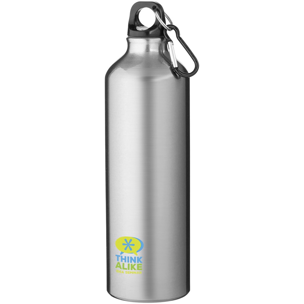 Einwandige Flasche mit Schraubverschluss. Karabiner ist nicht für das Klettern geeignet. Volumen 770 ml.