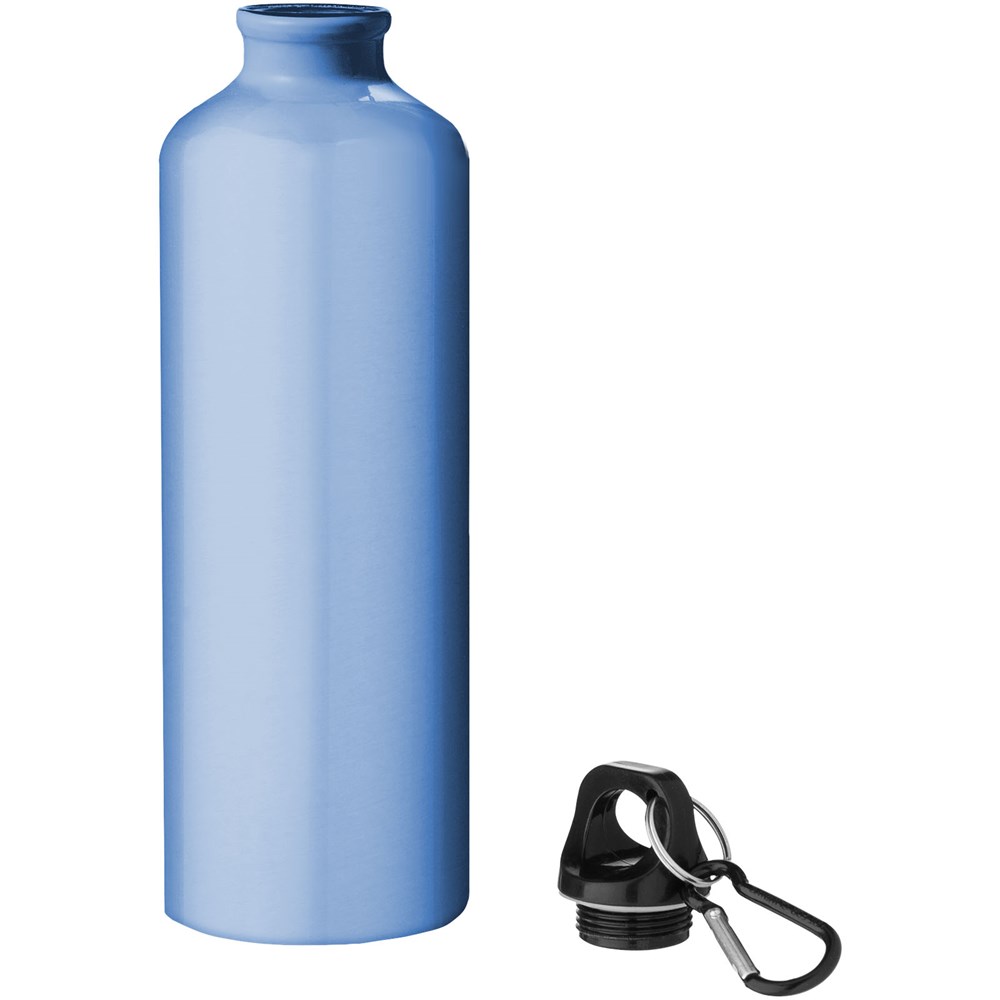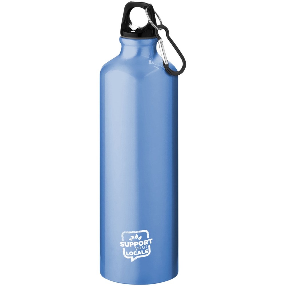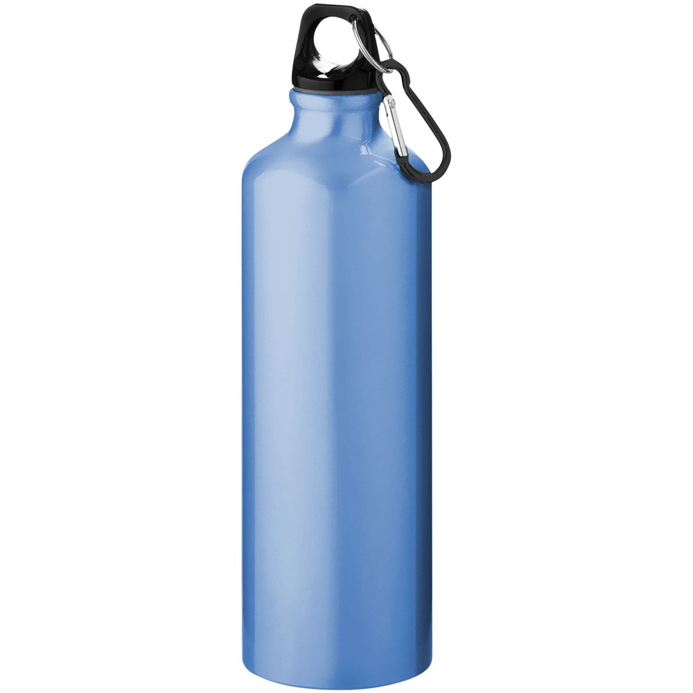 Einwandige Flasche mit Schraubverschluss. Karabiner ist nicht für das Klettern geeignet. Volumen 770 ml.