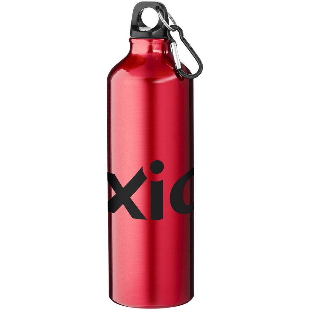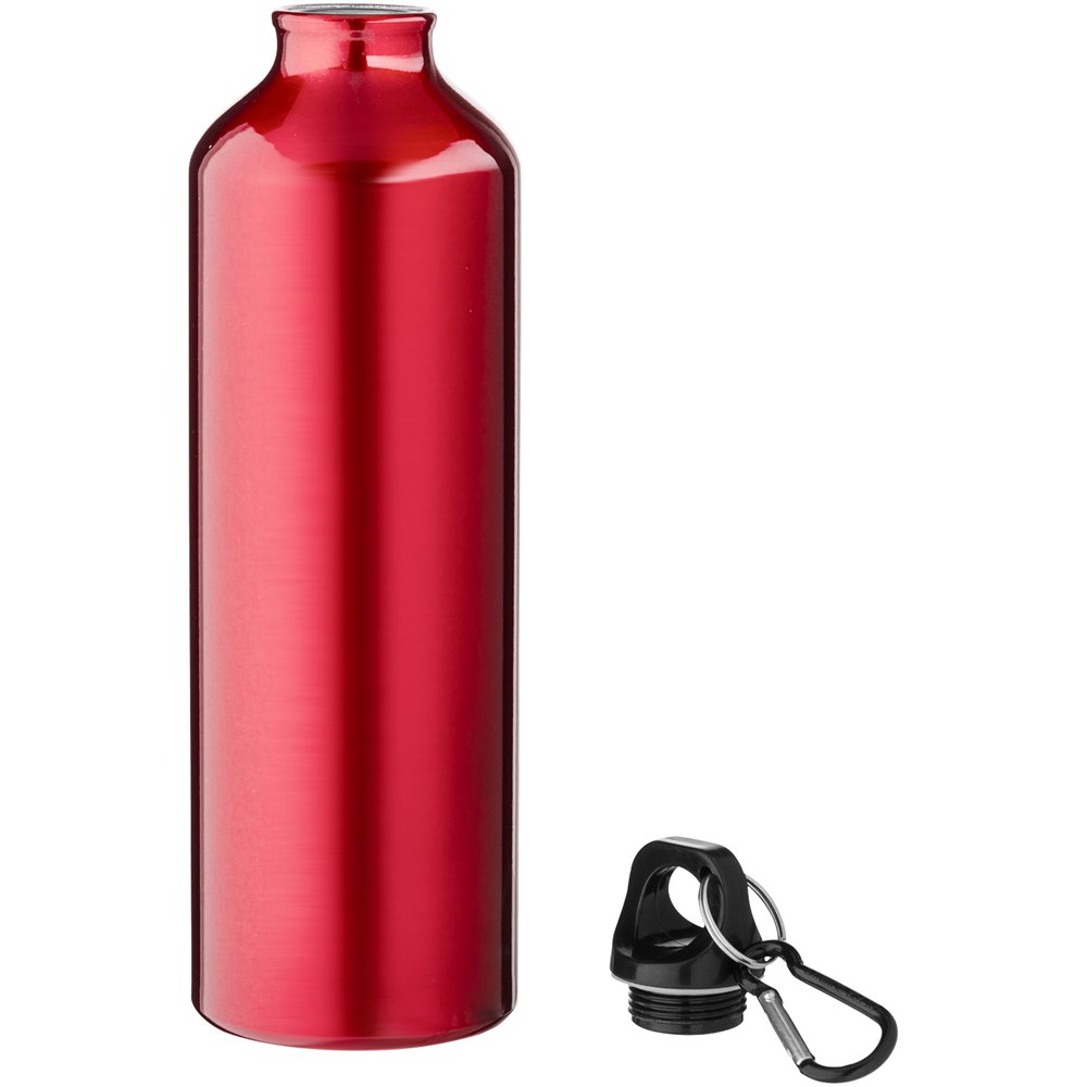 Einwandige Flasche mit Schraubverschluss. Karabiner ist nicht für das Klettern geeignet. Volumen 770 ml.
