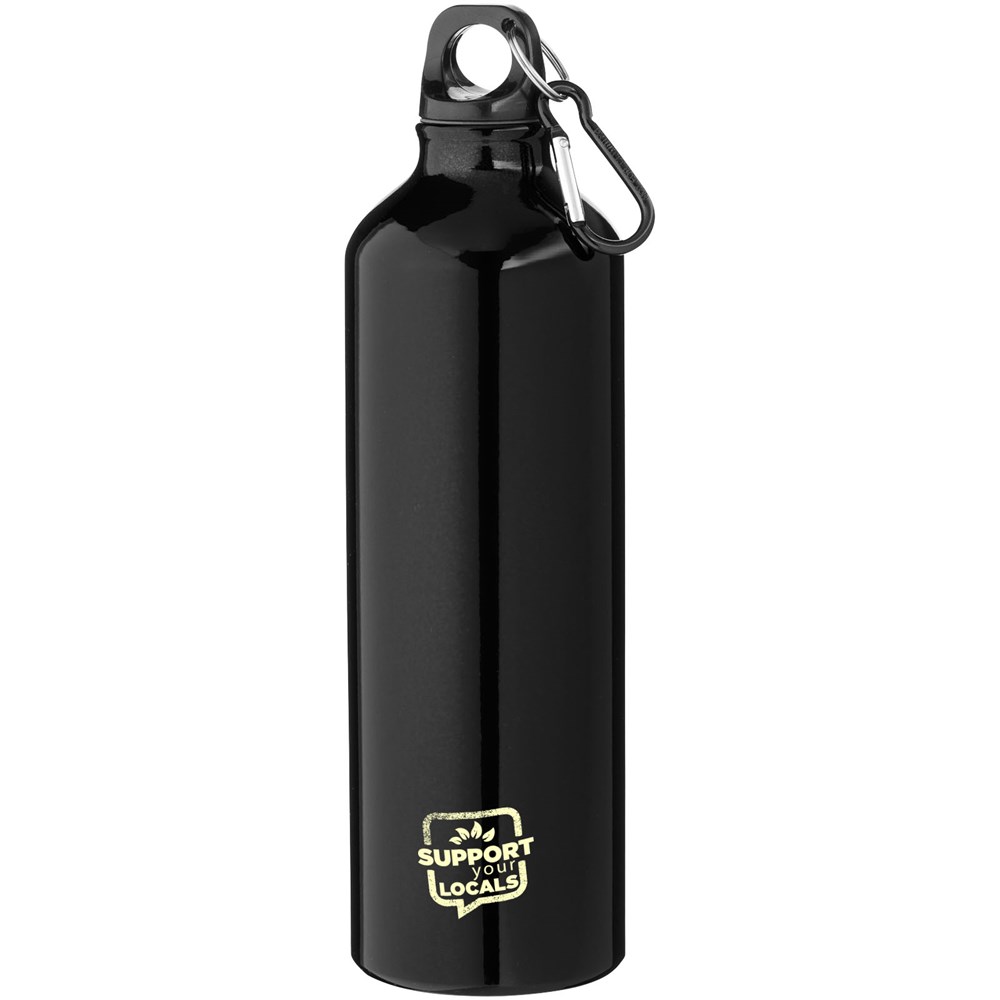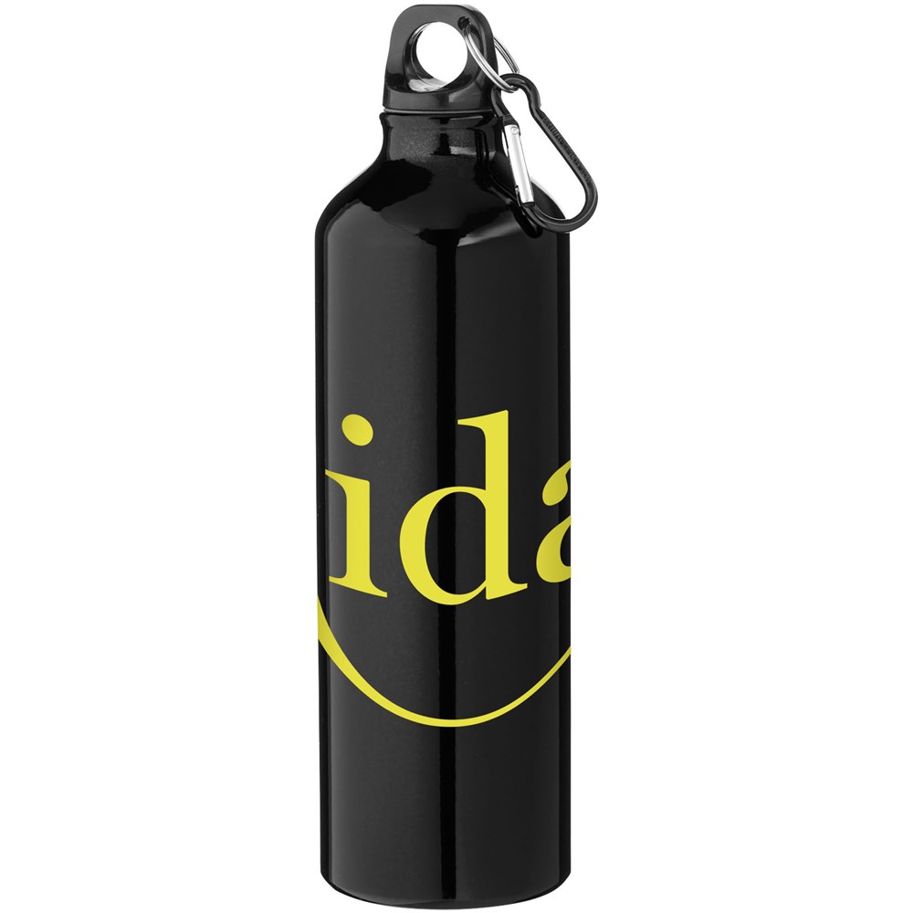Einwandige Flasche mit Schraubverschluss. Karabiner ist nicht für das Klettern geeignet. Volumen 770 ml.