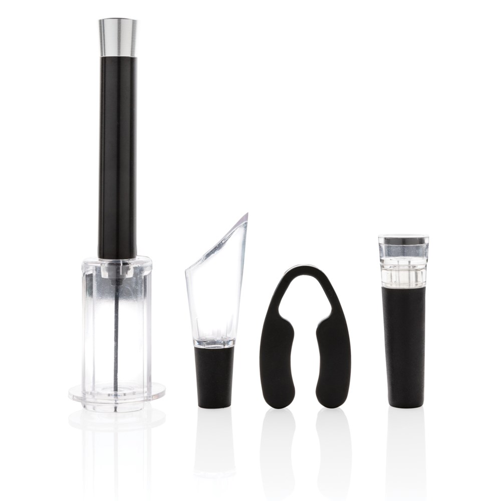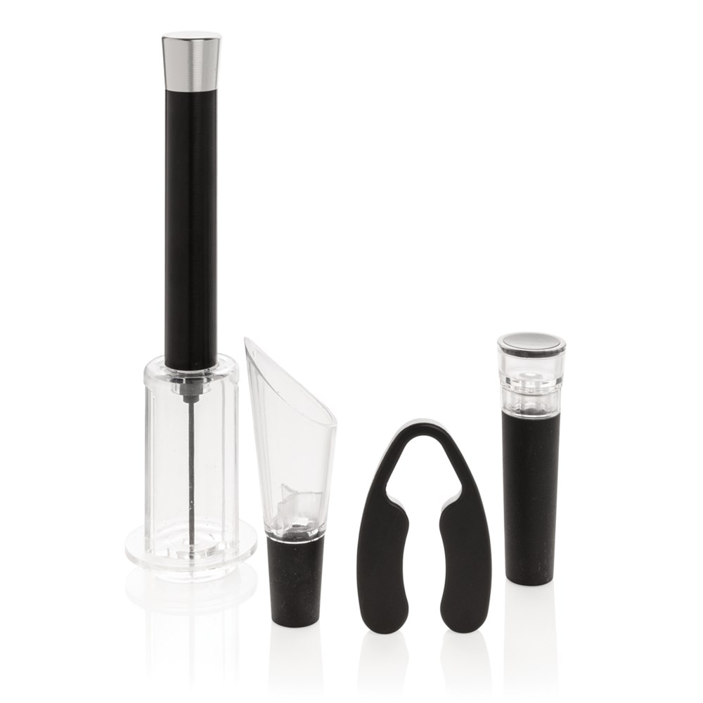 Mit dem Vino Connoisseur Set haben Sie alles was Sie zum Öffnen, Servieren und Lagern Ihres Lieblingsweins brauchen. Der Öffner, der Folienschneider, der Stopfen mit Vakuumpumpe sowie der Ausgießer mit Belüfter sind in einer schicken Box verpackt