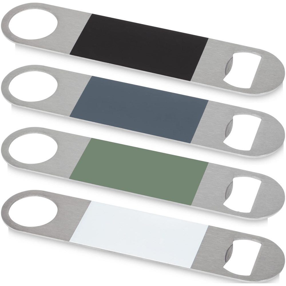 Flaschenöffner aus Edelstahl mit einer großen farbigen Fläche in der Mitte. mehr