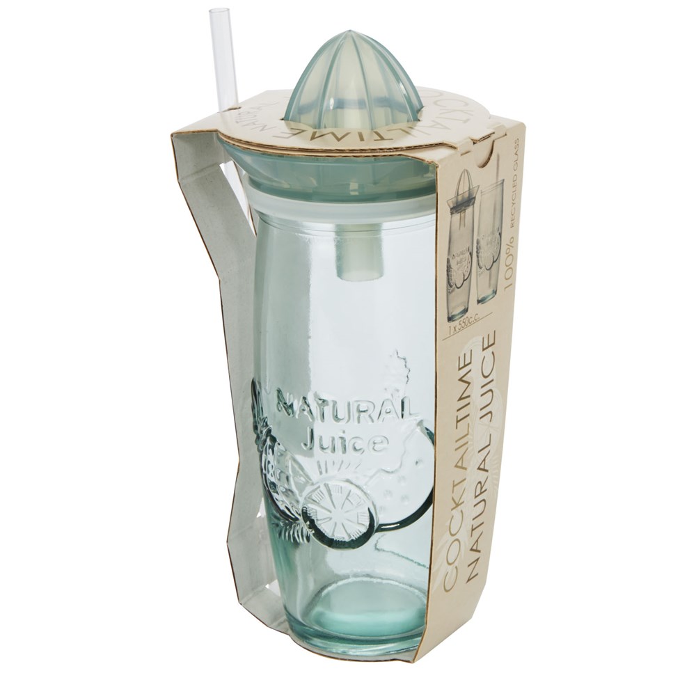 550 ml Cocktailbecher aus recyceltem Glas inklusive Zitruspresse und Strohhalm. Hergestellt aus 1 Glasflasche. Recyceltes Glas wird mit weniger Energie, Rohstoffen und Additiven hergestellt als für die Herstellung von herkömmlichem Glas erforderlich.