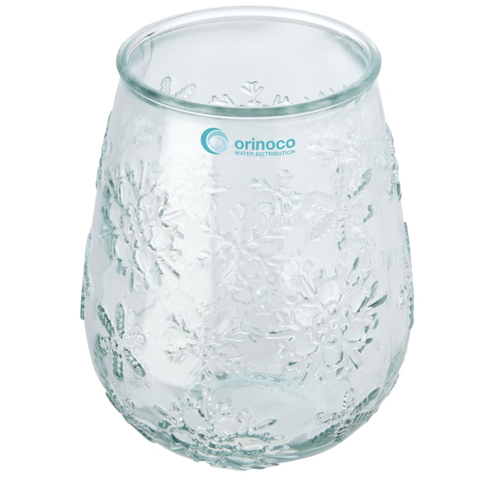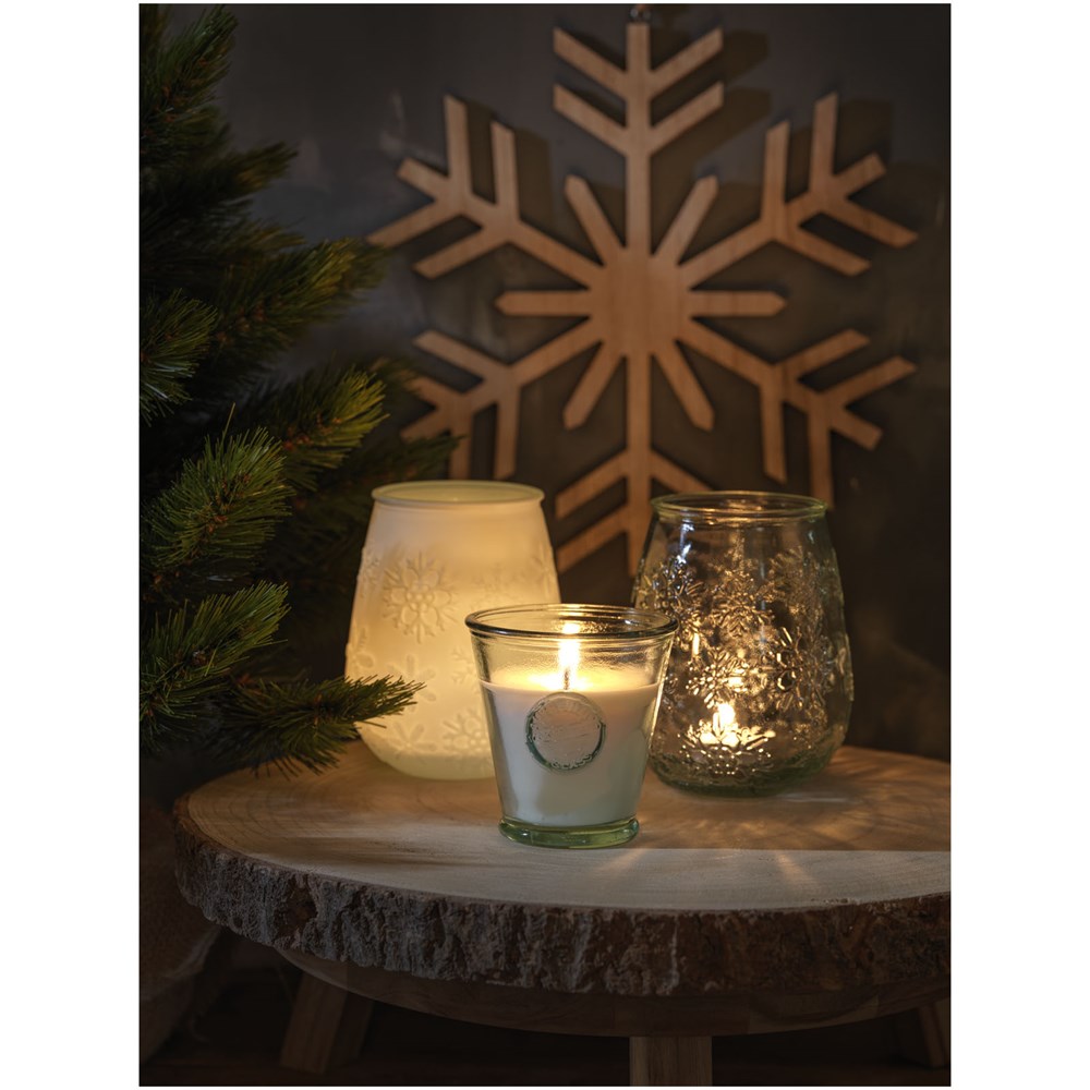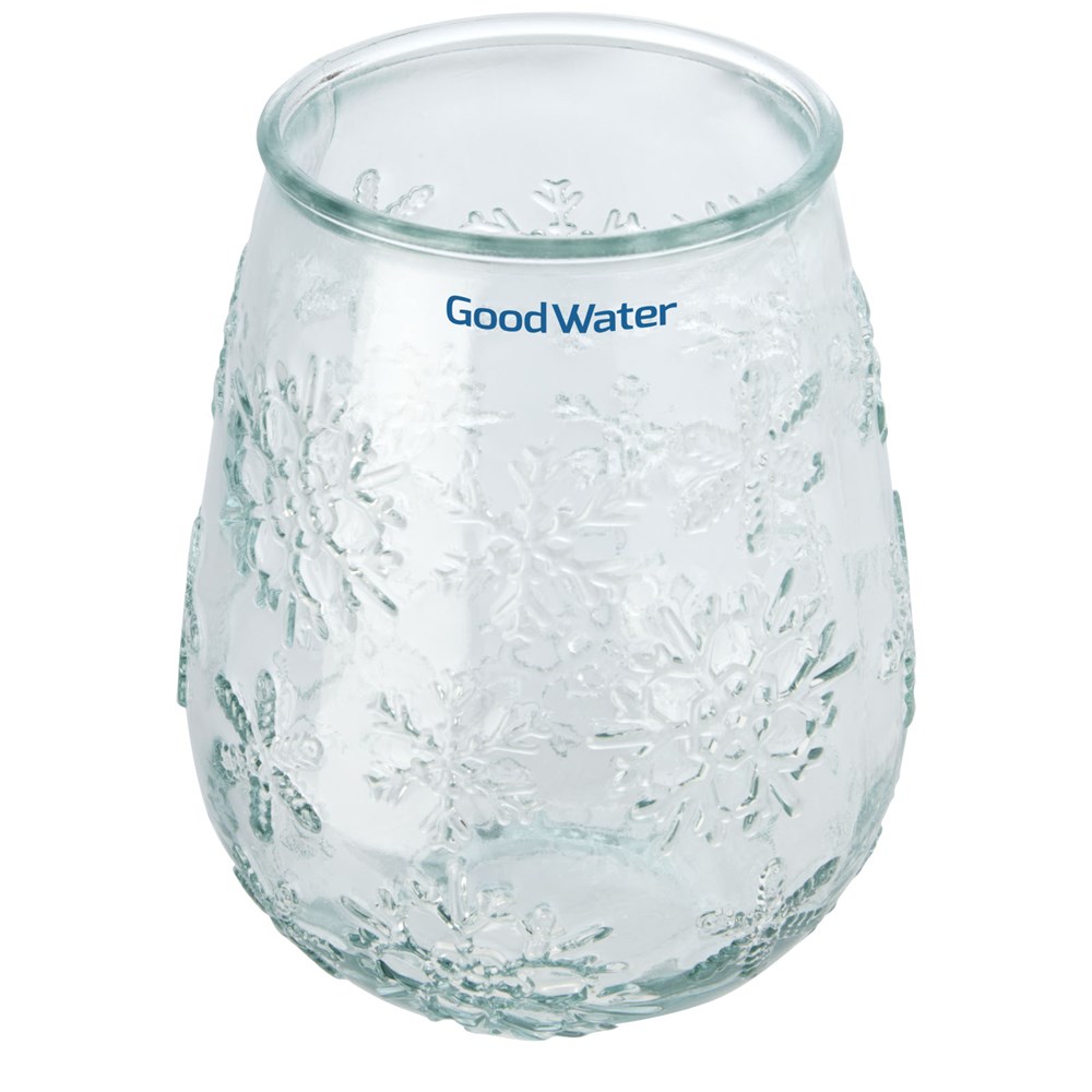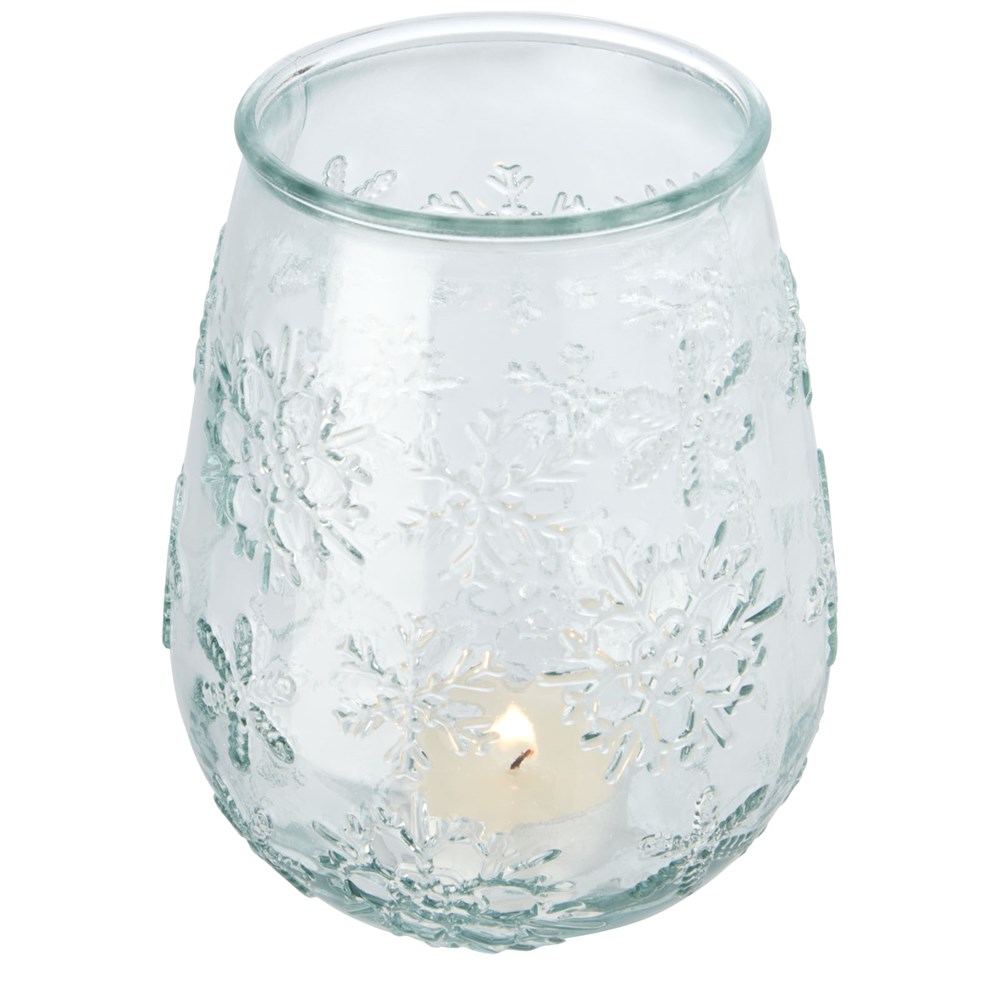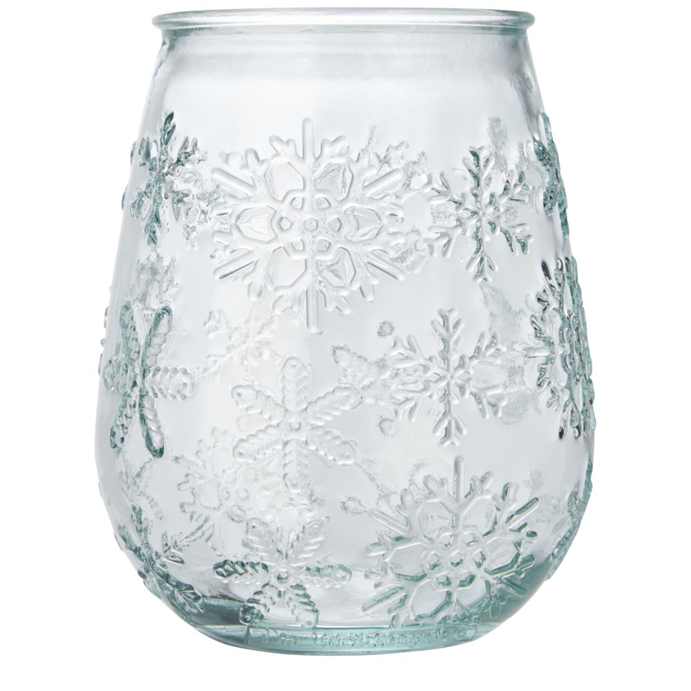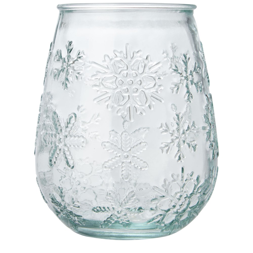 Teelichthalter aus recyceltem Glas mit Schneeflockeneffekt. Hergestellt aus 1 Glasflasche. Recyceltes Glas wird mit weniger Energie, Rohstoffen und Additiven hergestellt als für die Herstellung von herkömmlichem Glas erforderlich. Teelicht nicht enthalten.