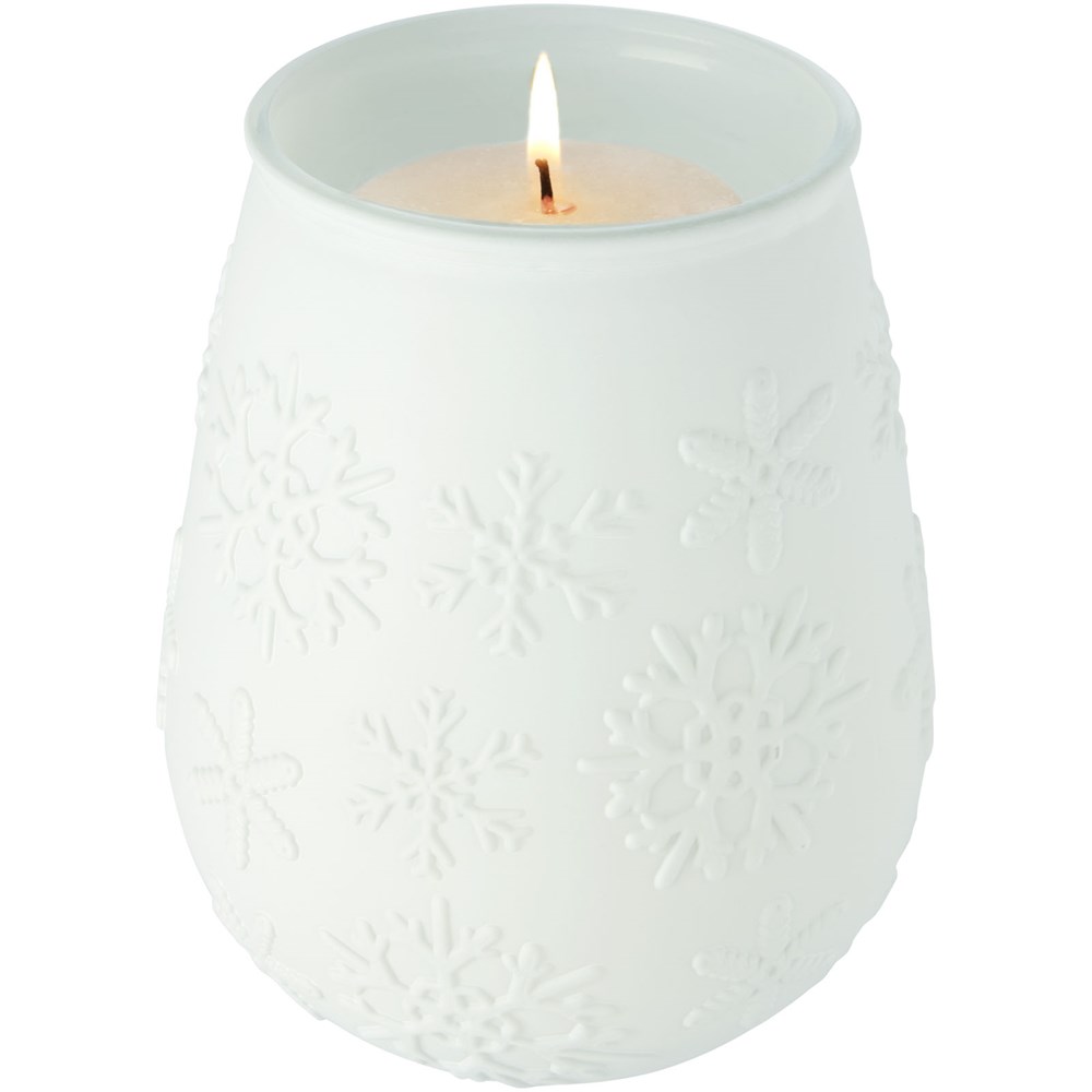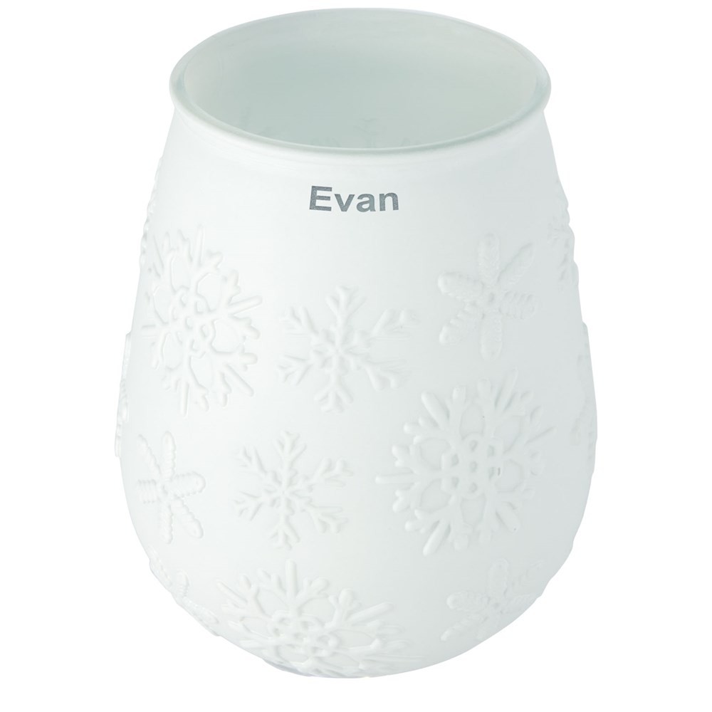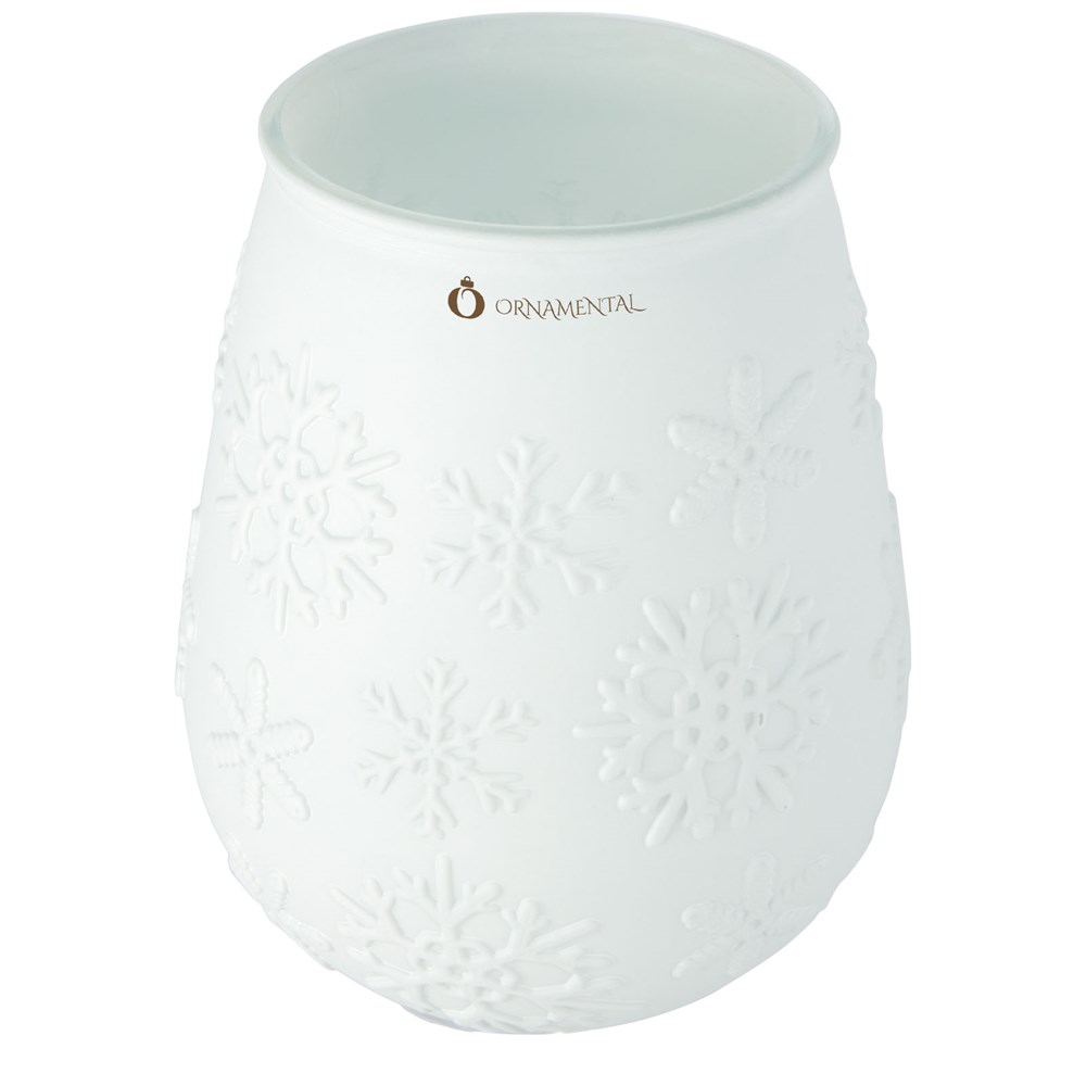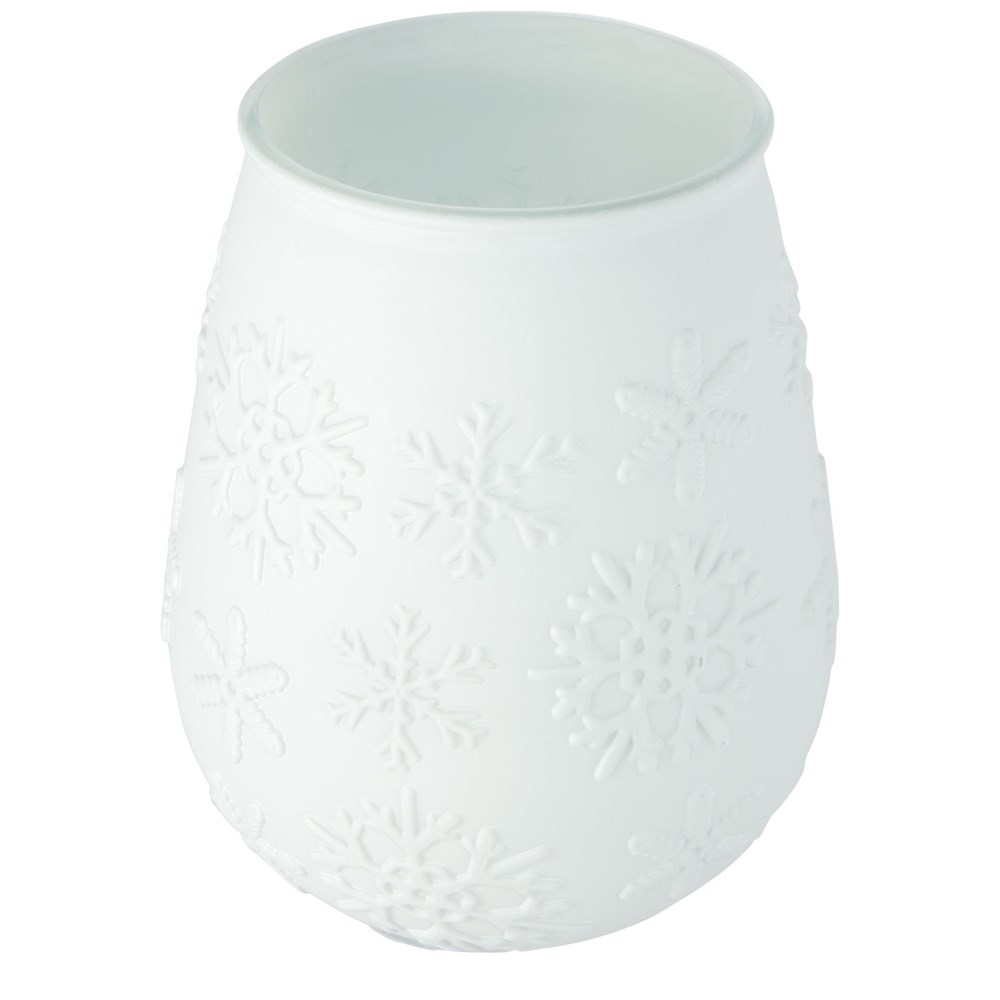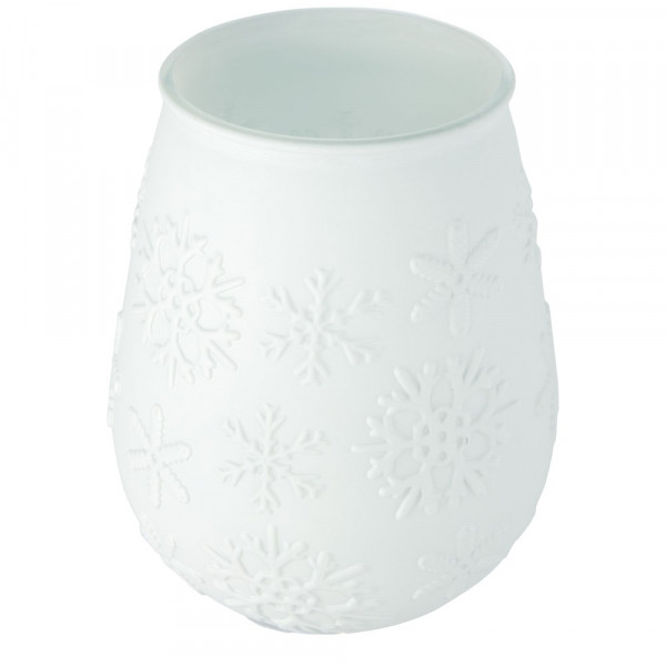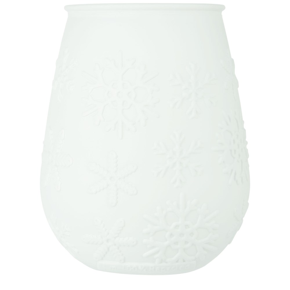 Teelichthalter aus recyceltem Glas mit Schneeflockeneffekt. Hergestellt aus 1 Glasflasche. Recyceltes Glas wird mit weniger Energie, Rohstoffen und Additiven hergestellt als für die Herstellung von herkömmlichem Glas erforderlich. Teelicht nicht enthalten.