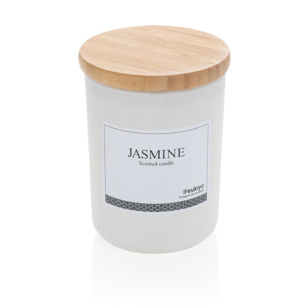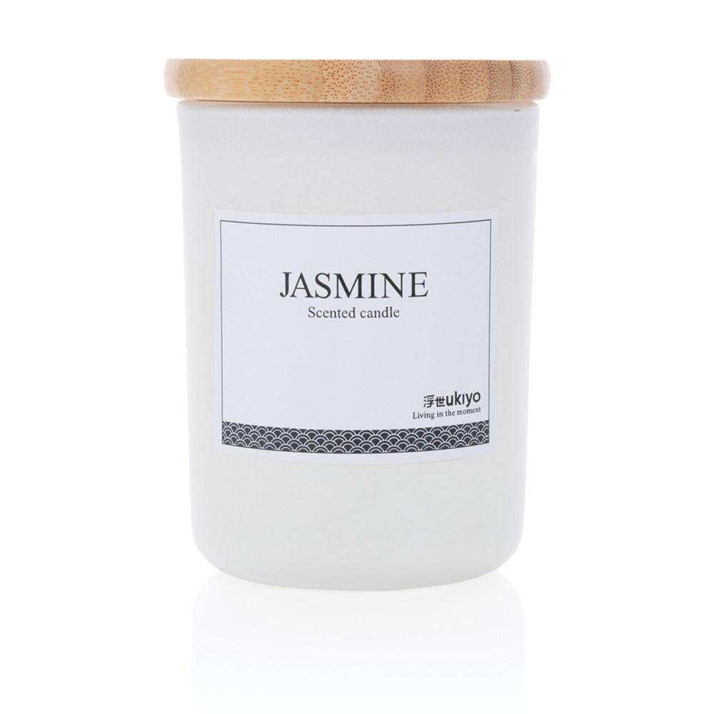 Schaffen Sie Wärme und Gemütlichkeit in Ihrem Zuhause mit dieser Ukiyo Jasmin-Duftkerze. Die Duftkerze wird in einem eleganten Glas mit Bambusdeckel geliefert.