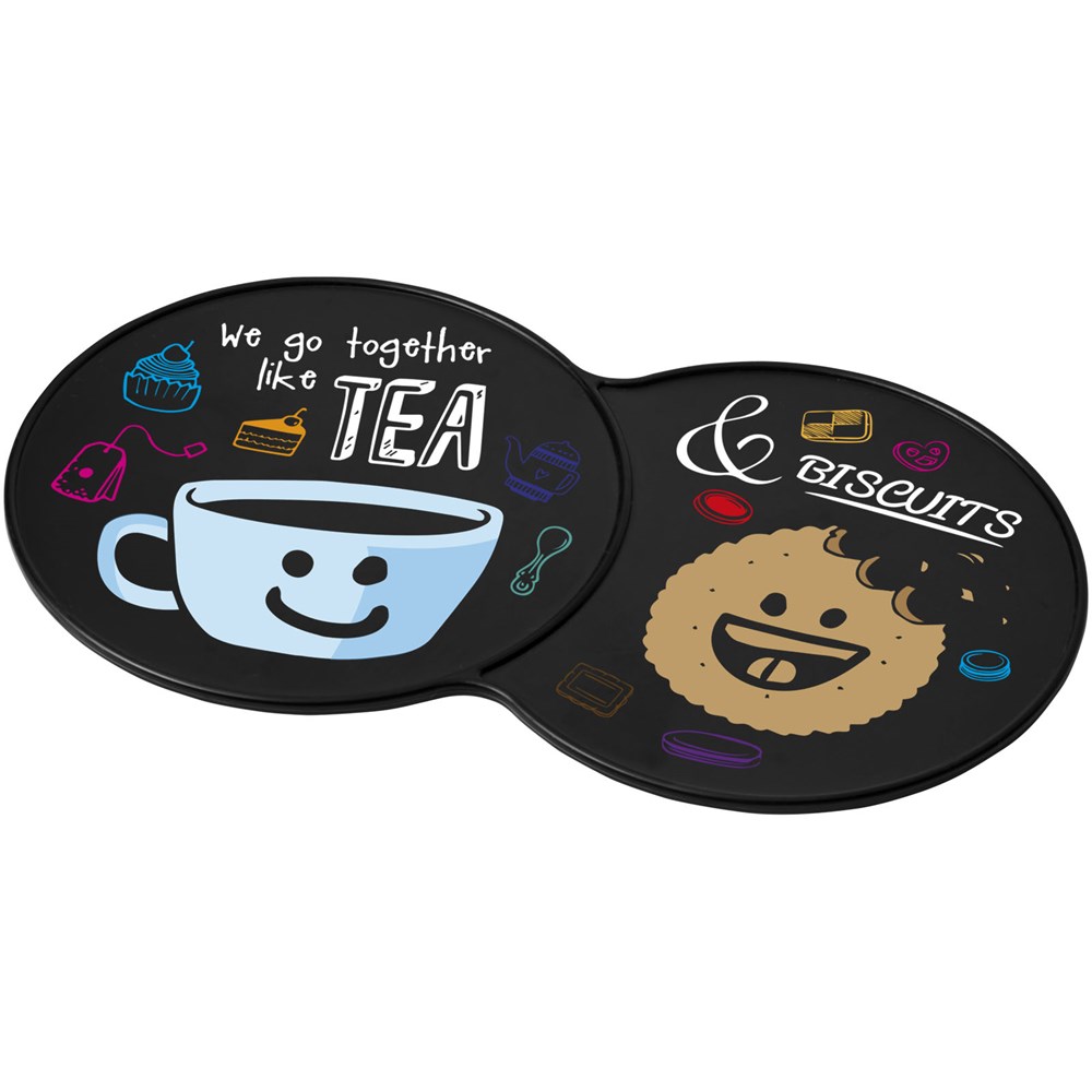 Vergrößerter Untersetzer mit Platz für mehrere Getränke oder eine Kombination aus einem Getränk und einem Keks.