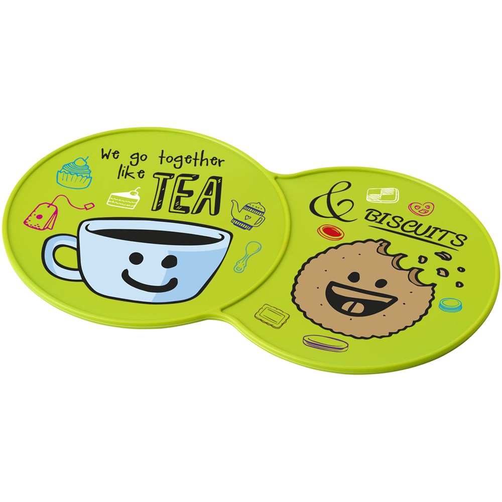 Vergrößerter Untersetzer mit Platz für mehrere Getränke oder eine Kombination aus einem Getränk und einem Keks.