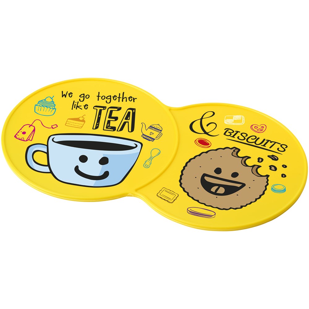 Vergrößerter Untersetzer mit Platz für mehrere Getränke oder eine Kombination aus einem Getränk und einem Keks.