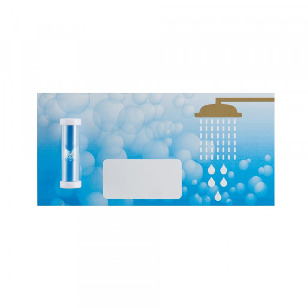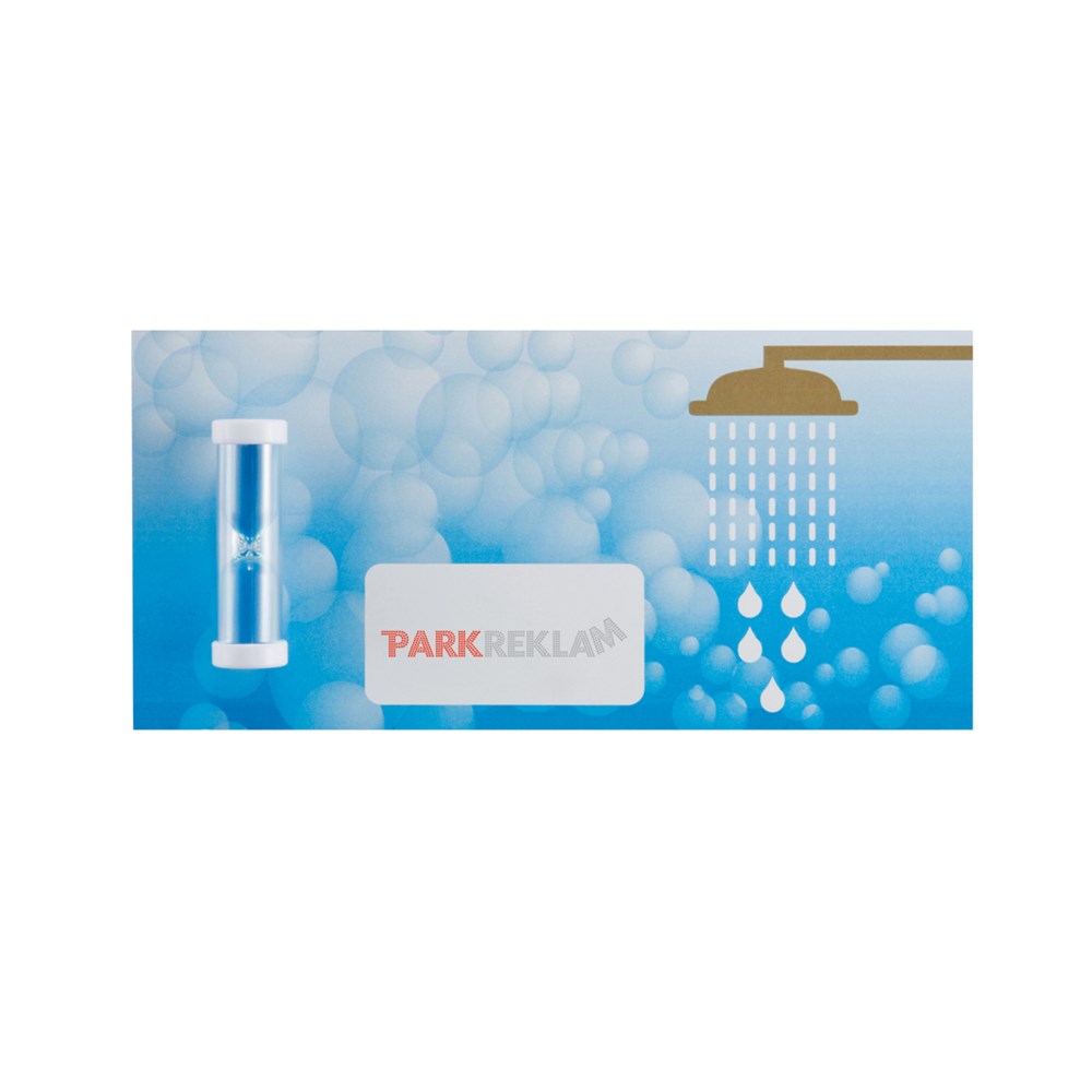 Mini Duschcoach mit Kunststoffgehäuse, inkl. Silikonsaugnapf auf der Rückseite und 5-Minutenzähler mit Sand auf der Vorderseite.