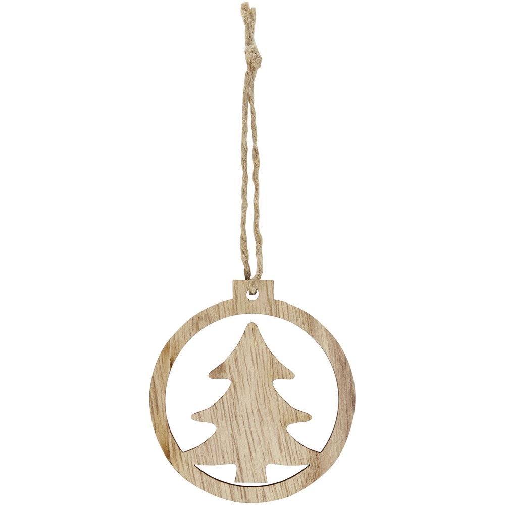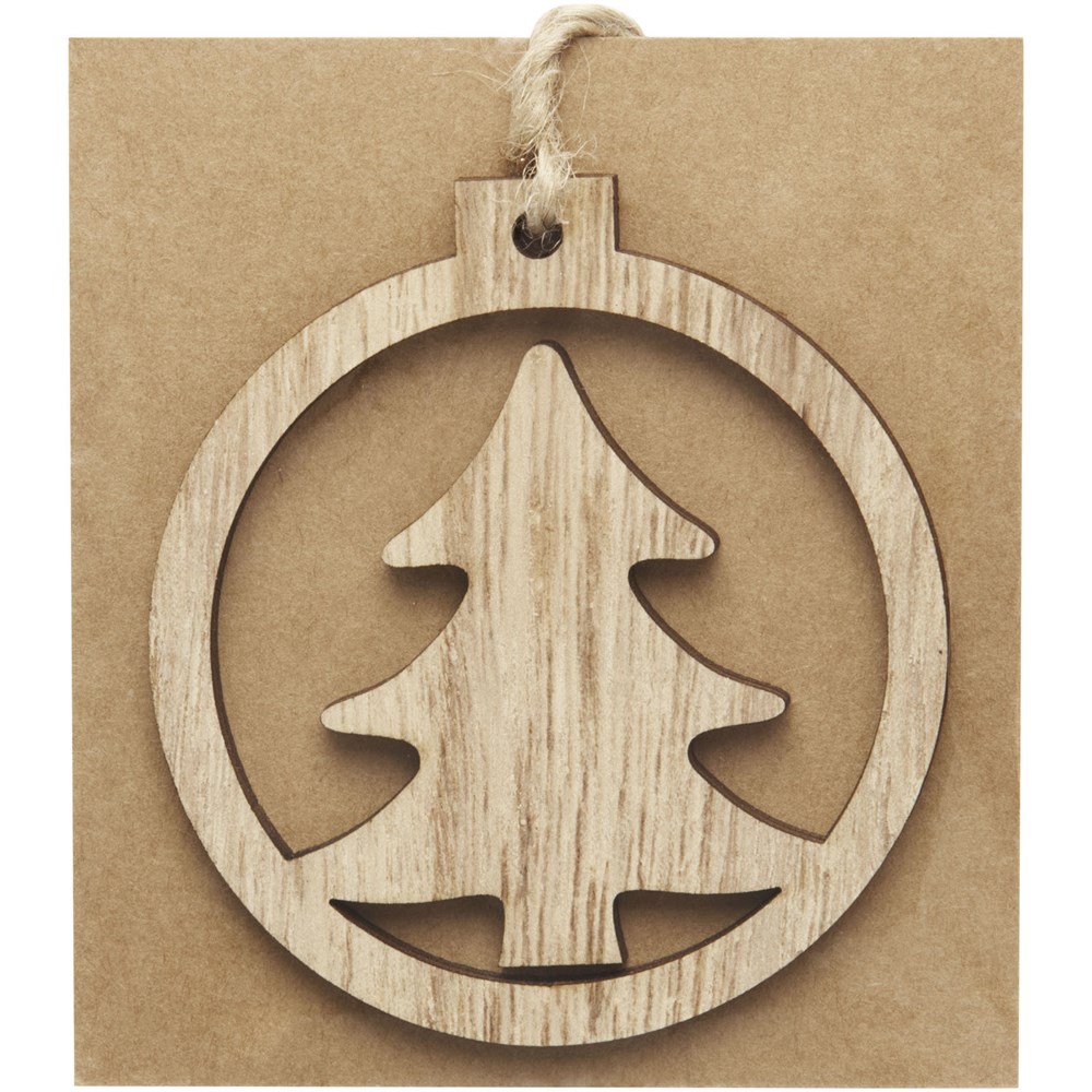 Holzornament in runder Form mit einem Tannenbaum im Inneren. Mit einem Aufhänger und einer Kordel. Einzeln verpackt mit einer Kraftpapierkarte auf der Rückseite.