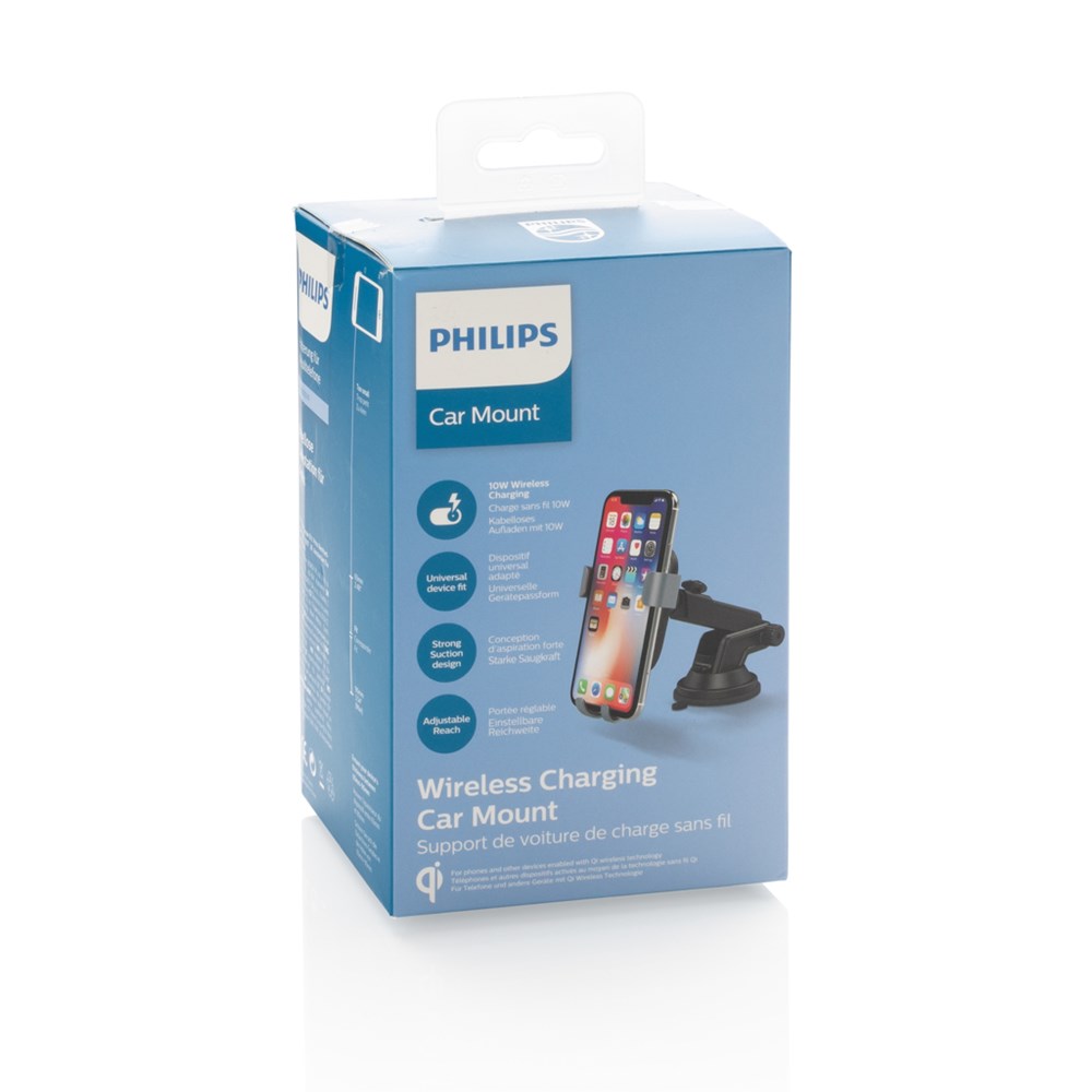 Philips Qi 10W kabellose Autohalterung mit Schnellladefunktion. Schnappen Sie Ihr Handy ein, mit Gelenkarm für Schwenk- und Neigebewegungen. Das Befestigungssystem wird an der Lüftungsöffnung Ihres Autos befestigt. Passend für Universalgeräte von 65mm-90mm Breite. Inkl. 1m Micro-USB-Kabel. Input: 5V/2A; Wireless-Output: 5W/7,5W/10W. Verpackt in einer Philips Geschenkbox.