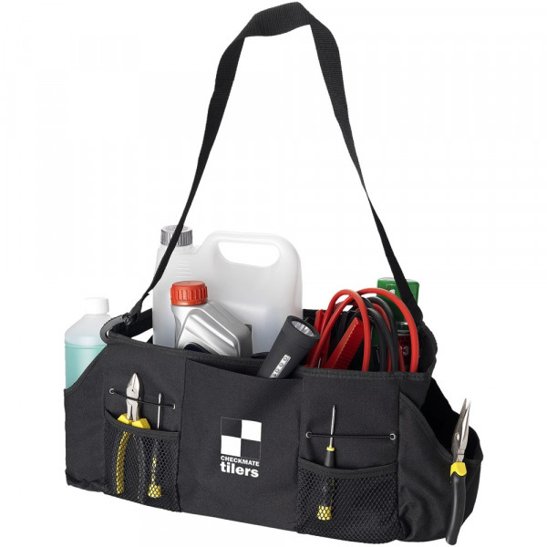 Faltbarer Innenteil kann als einzelnes oder aufgeteiltes Fach verwendet werden. Inkl. 5 Außentaschen, Klettband zur Sicherung auf der Unterseite im Koffer- oder Fußraum Ihres Autos.