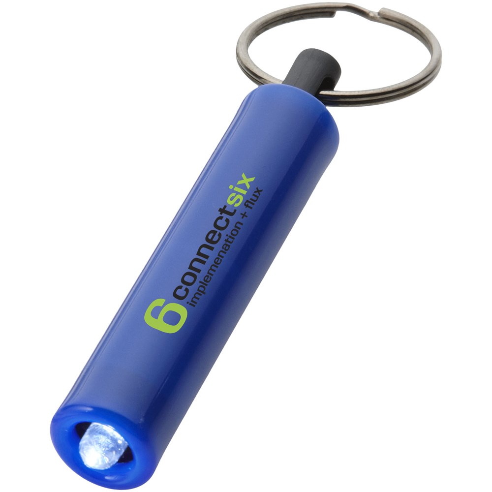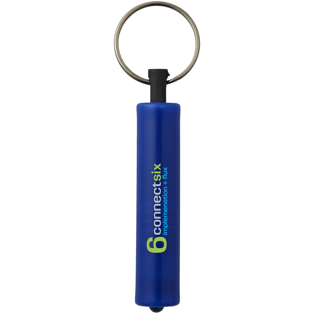 Ein weißes LED Licht, das mit einer Drucktaste ein- und ausgeschaltet wird. Geteilter Schlüsselring aus Metall. Inkl. Batterien.