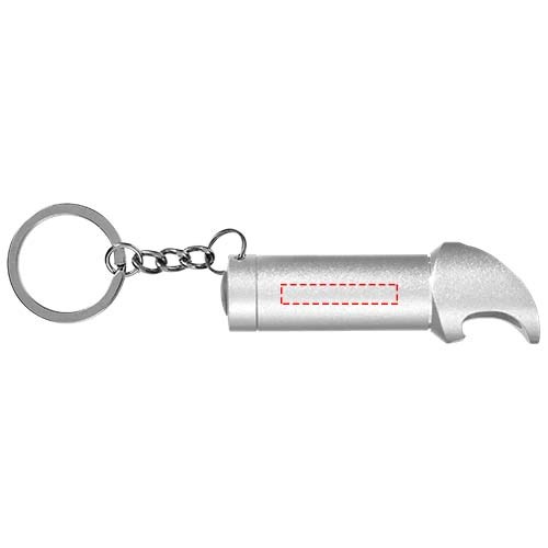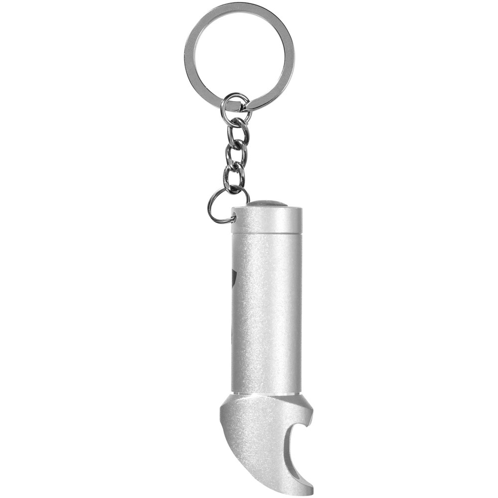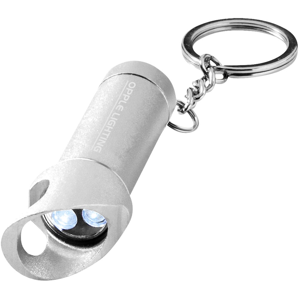 Lampe mit 3 weißen LEDs und Flaschenöffner. Drucktaste zum Ein/Ausschalten. Geteilter Schlüsselring aus Metall. Inkl. Batterien.