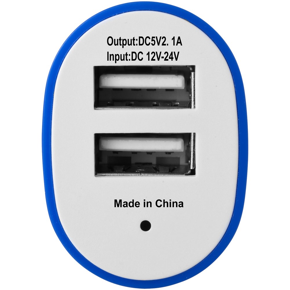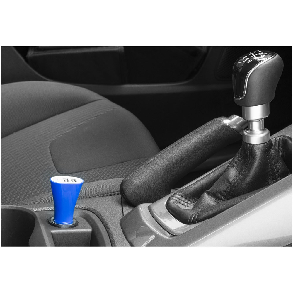 Doppelstecker-Adapter. Kann zum Aufladen persönlicher Geräte an eine Autosteckdose angeschlossen werden. USB-Ausgang: 5 Volt/2,0 A. Eingang: 12 V - 24 V. Geeignet für Autos und LKW.