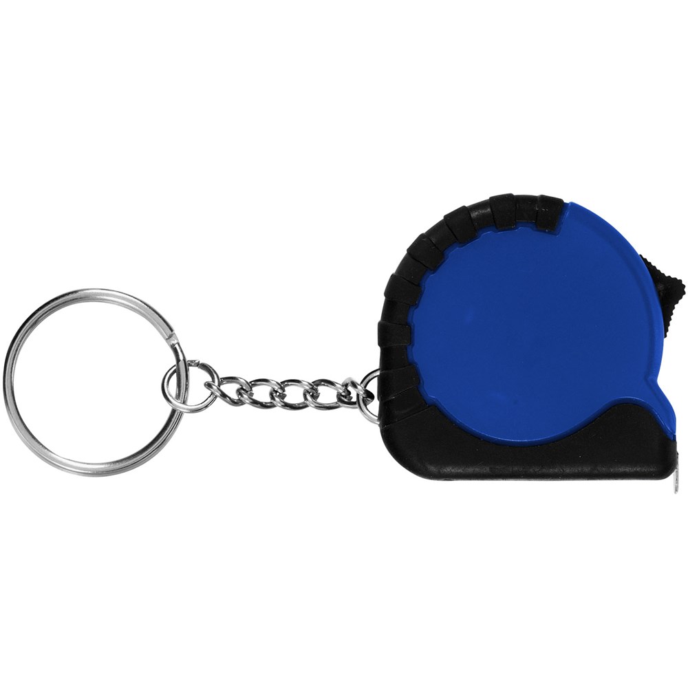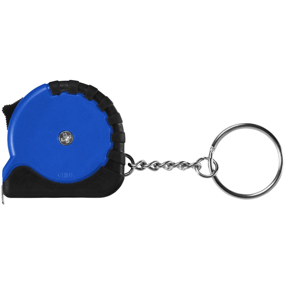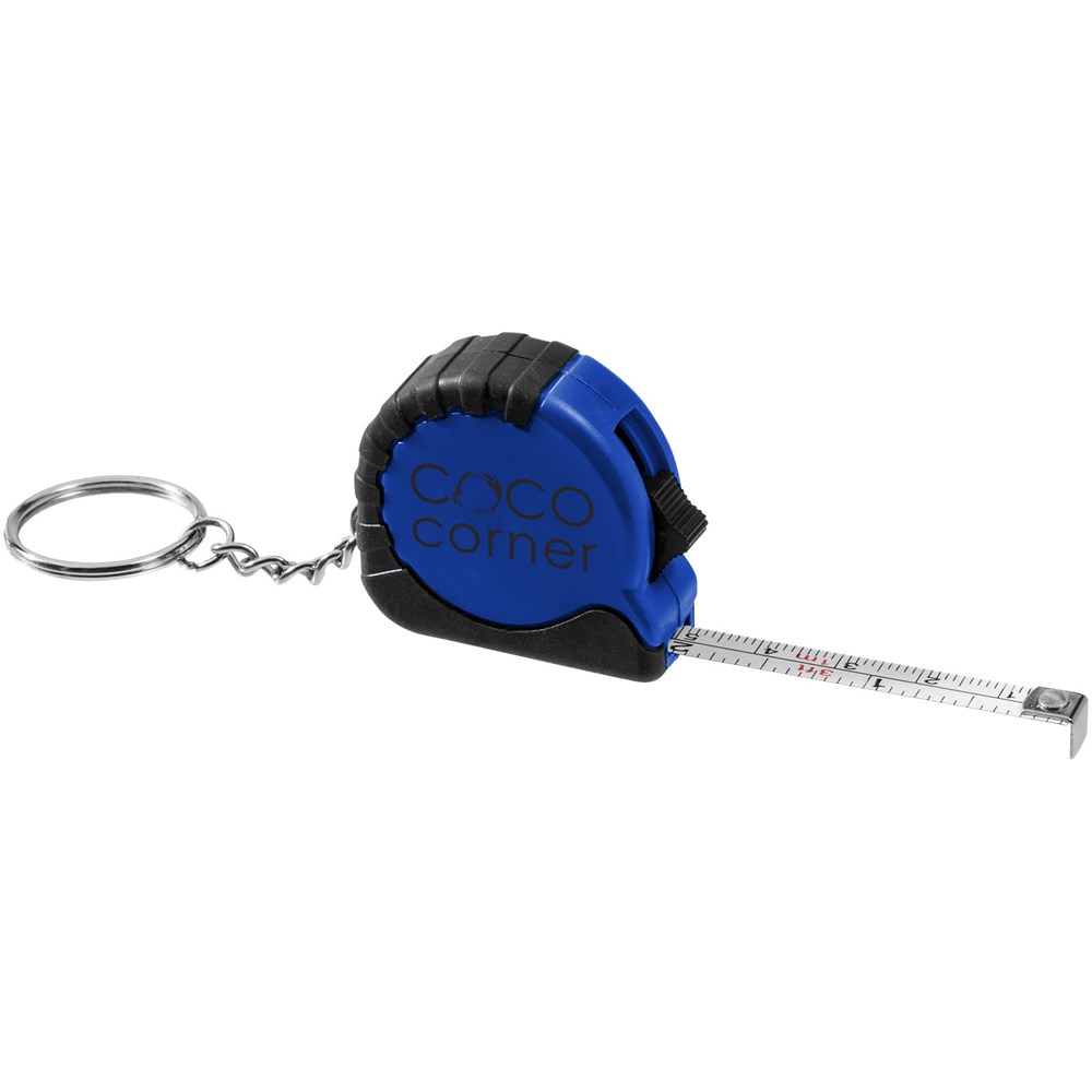 1 Meter langes, einziehbares, einrastendes Maßband zeigt Zentimeter und Zoll an. Schiebetaste zum Verriegeln des Maßbandes. Gummigriff. Schlüsselanhänger mit geteiltem Ring aus Metall.