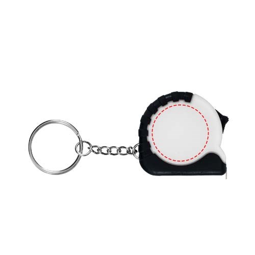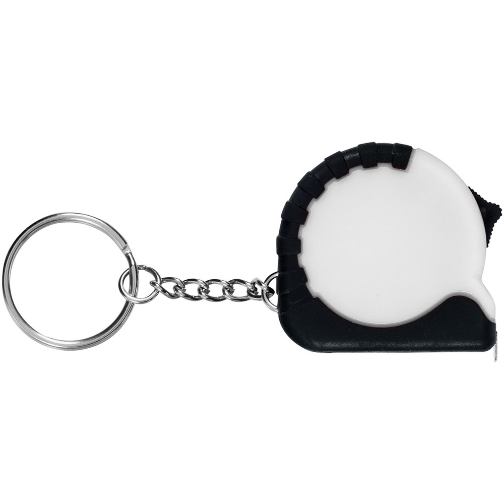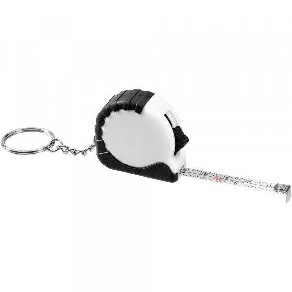 1 Meter langes, einziehbares, einrastendes Maßband zeigt Zentimeter und Zoll an. Schiebetaste zum Verriegeln des Maßbandes. Gummigriff. Schlüsselanhänger mit geteiltem Ring aus Metall.