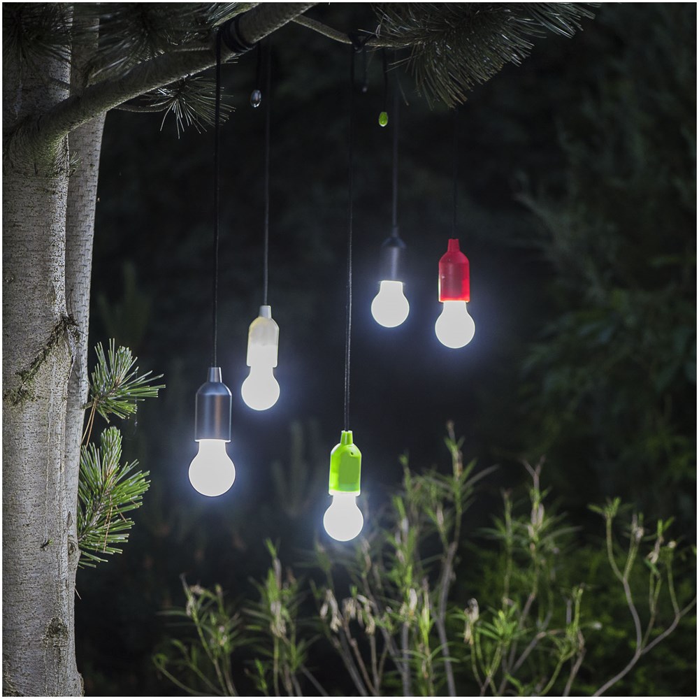 Lampe in Form einer Glühbirne mit weißem LED Licht und Zugschalter. Praktische Lampe, die für Licht sorgt, wann und wo Sie es möchten, z. B. in Ihrer Garage, im Schrank, im Freien oder auf dem Campingplatz. Inkl. 3 x AAA Batterien.