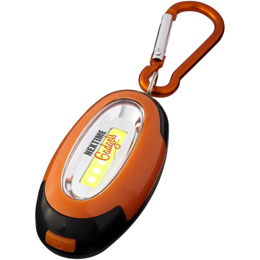 Ultra helles COB Licht mit Ein/Aus Schalter für dauerhaftes und blinkendes Licht. Mit Magnet auf der Rückseite, inkl. Batterien und farblich passendem Karabiner (nicht zum Klettern geeignet).