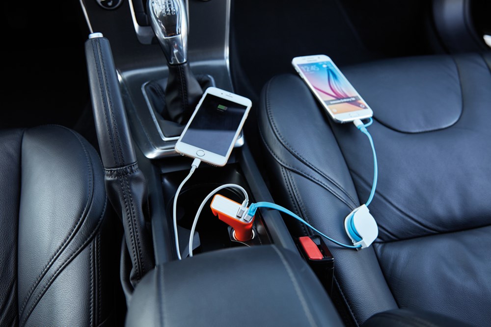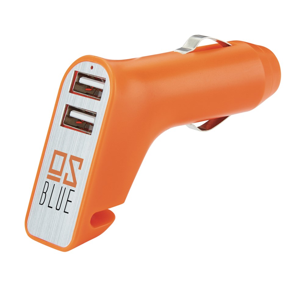 Dual USB Ladegerät zum Aufladen von 2 mobilen Geräten im Auto zur selben Zeit. Das Ladegerät verfügt über einen integrierten Gurtschneider und Notfallhammer, sodass Sie im Notfall alle Tools griffbereit haben. Output: 5V/2.1A.