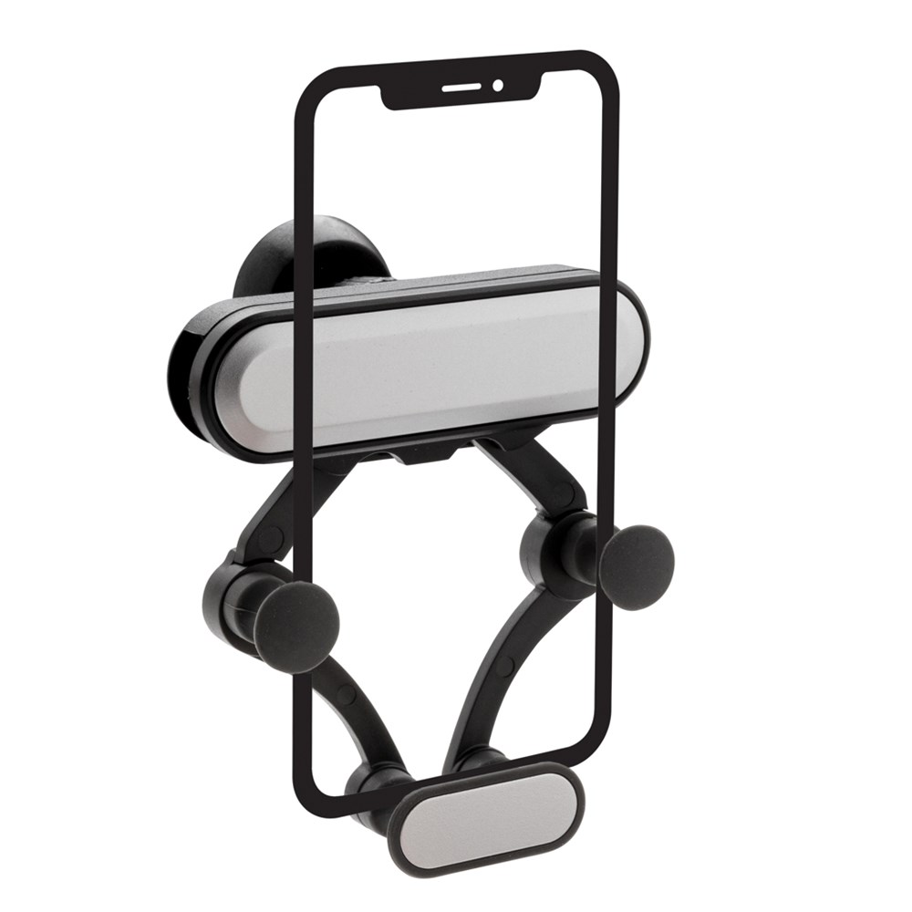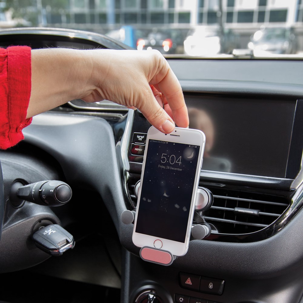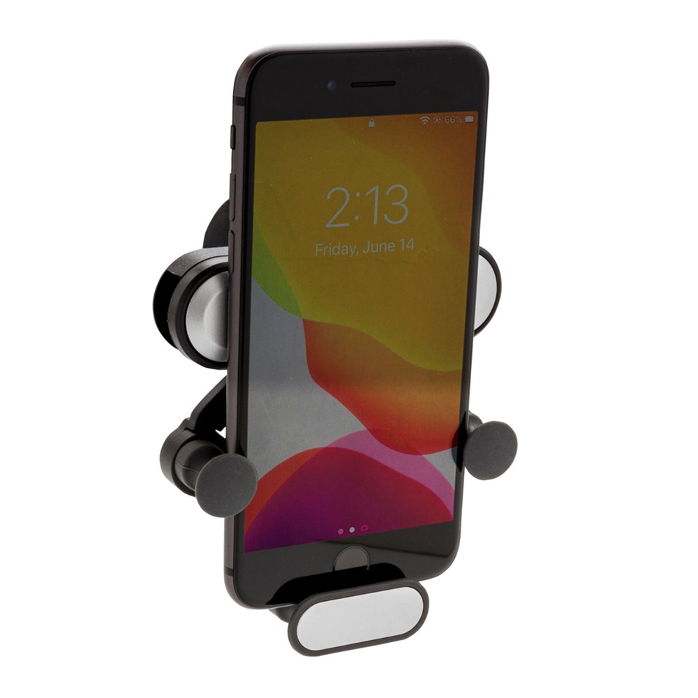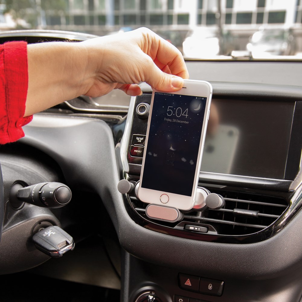 Universeller Phone-Halter der einfach in die Lüftungsschlitze Ihres Autos gesteckt wird. Passt sich automatisch für bis zu 6" Smartphones an. Sicherer Halt durch Details aus Silikon.