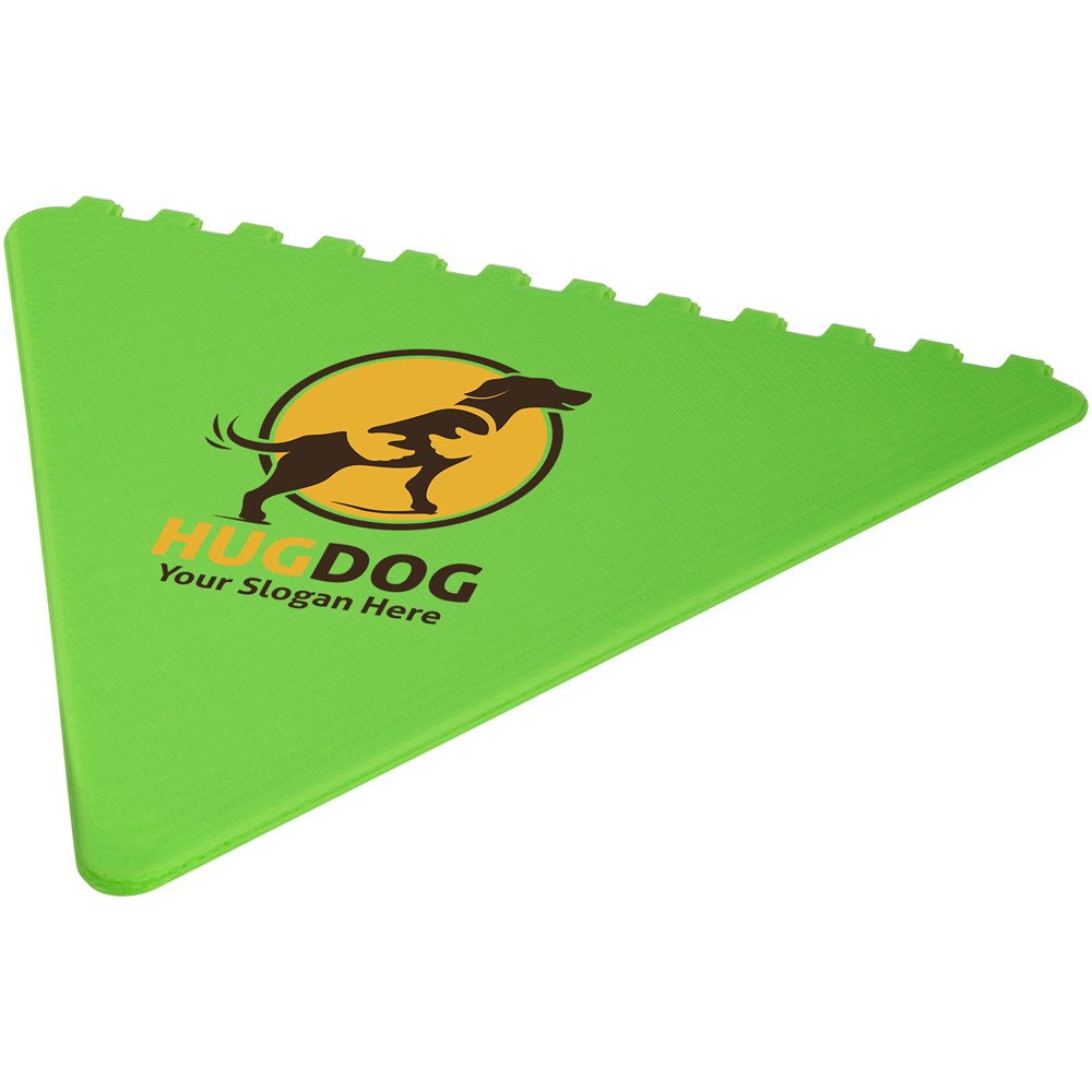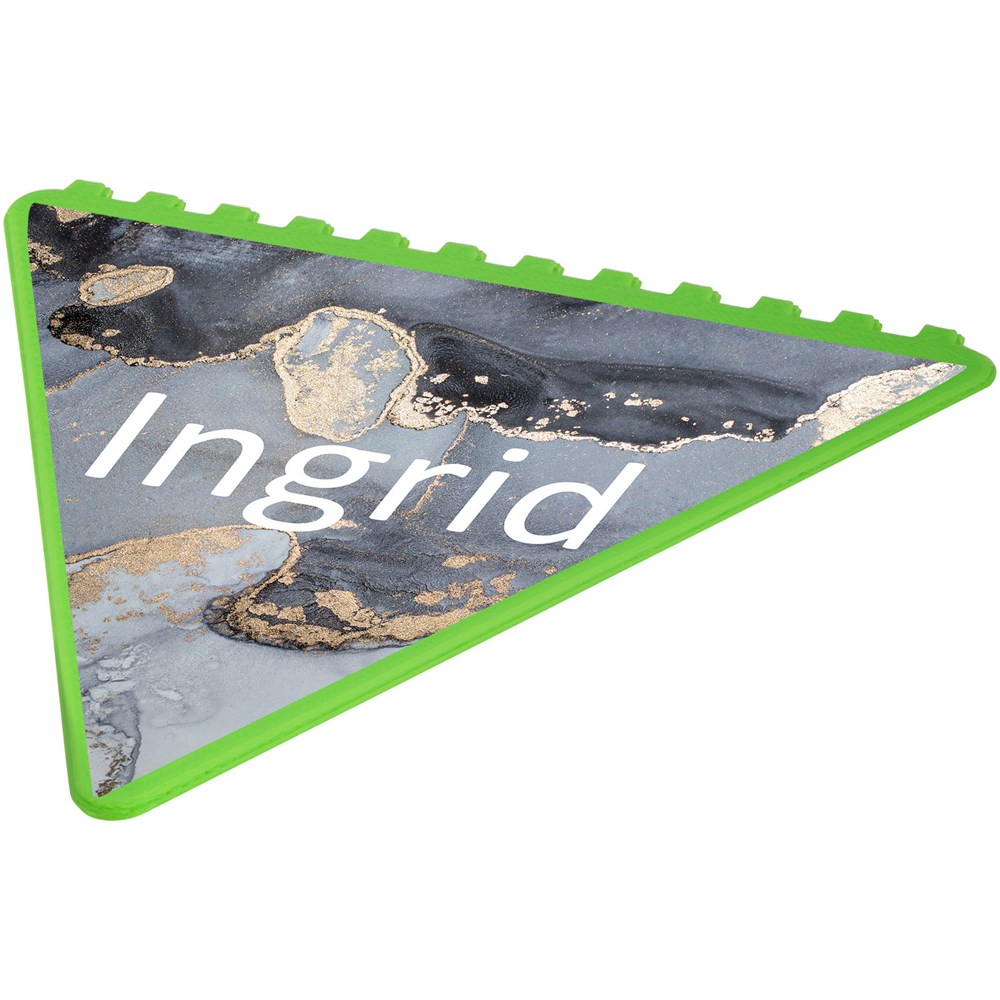 Dreieckiger Eiskratzer um die Windschutzscheibe von Eis und Schnee zu befreien mit einer großen Werbeanbringungssfläche. Jede der 3 Seiten kann zum Eiskratzen verwendet werden. Hergestellt in Großbritannien aus recyceltem Kunststoff.