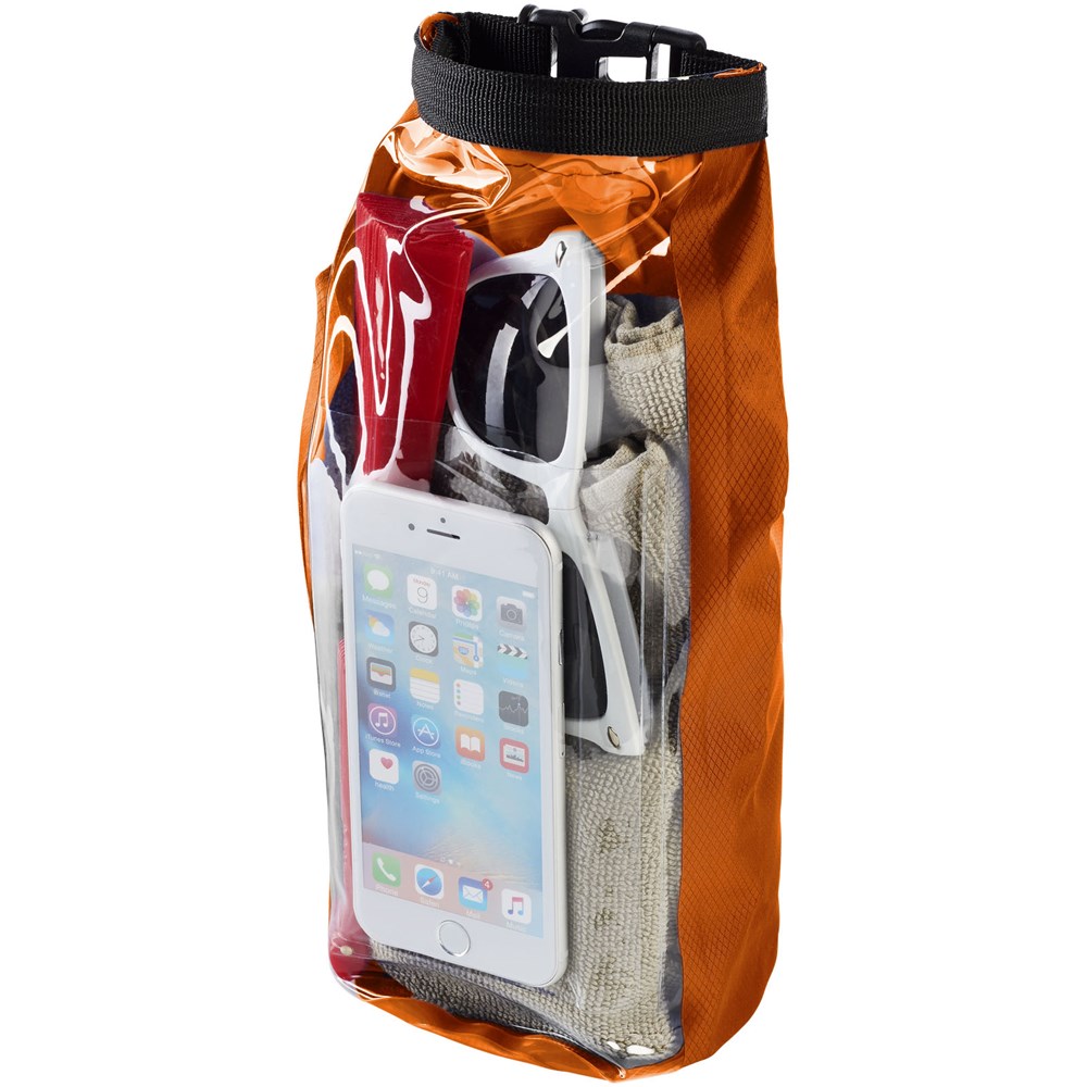 Eine wasserdichte Tasche, die großartige für die Aktivitäten im Freien geeignet ist. Der Rolltop-Verschluss mit Kunststoffschnalle stellt die trockene und sichere Aufbewahrung von Wertsachen sicher. Ein transparentes Fenster ermöglicht den Zugriff auf das Gerät während der Aufbewahrung. Kann problemlos an einer Tasche oder einem Gürtel befestigt werden. Heruntergerollt und verschlossen beträgt das Fassungsvermögen 2 Liter.