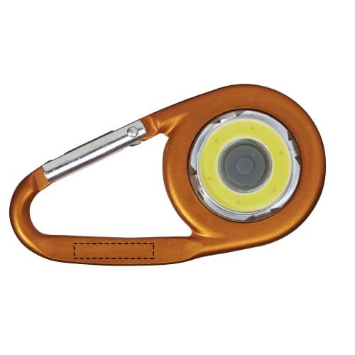 Karabiner mit COB LED Licht. Ein / Aus Schalter für hartes, weiches und blinkendes Licht. Flache Rückseite ideal für Werbeanbringung. Nicht zum Klettern geeignet. Inkl. Batterien.