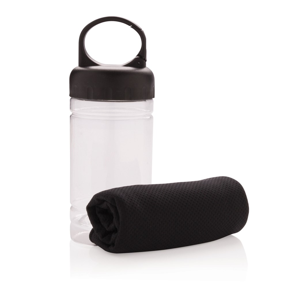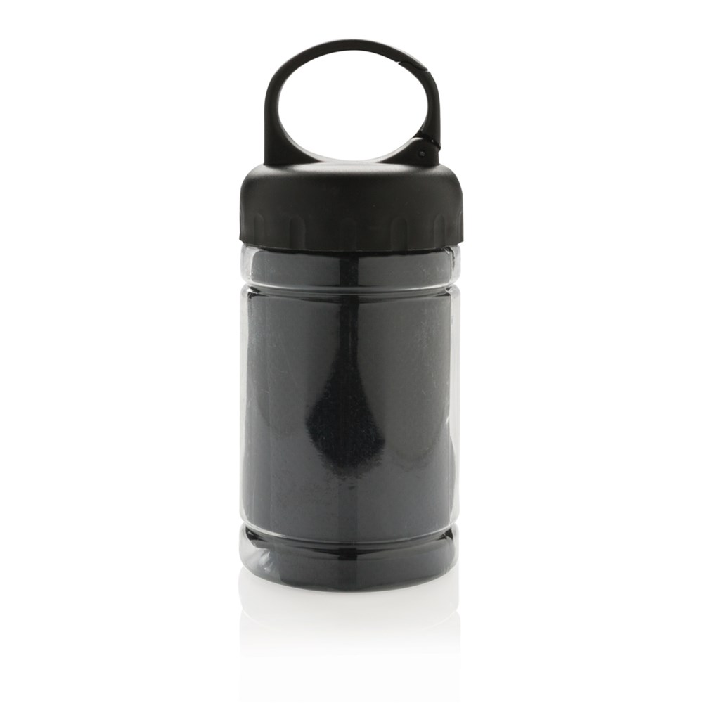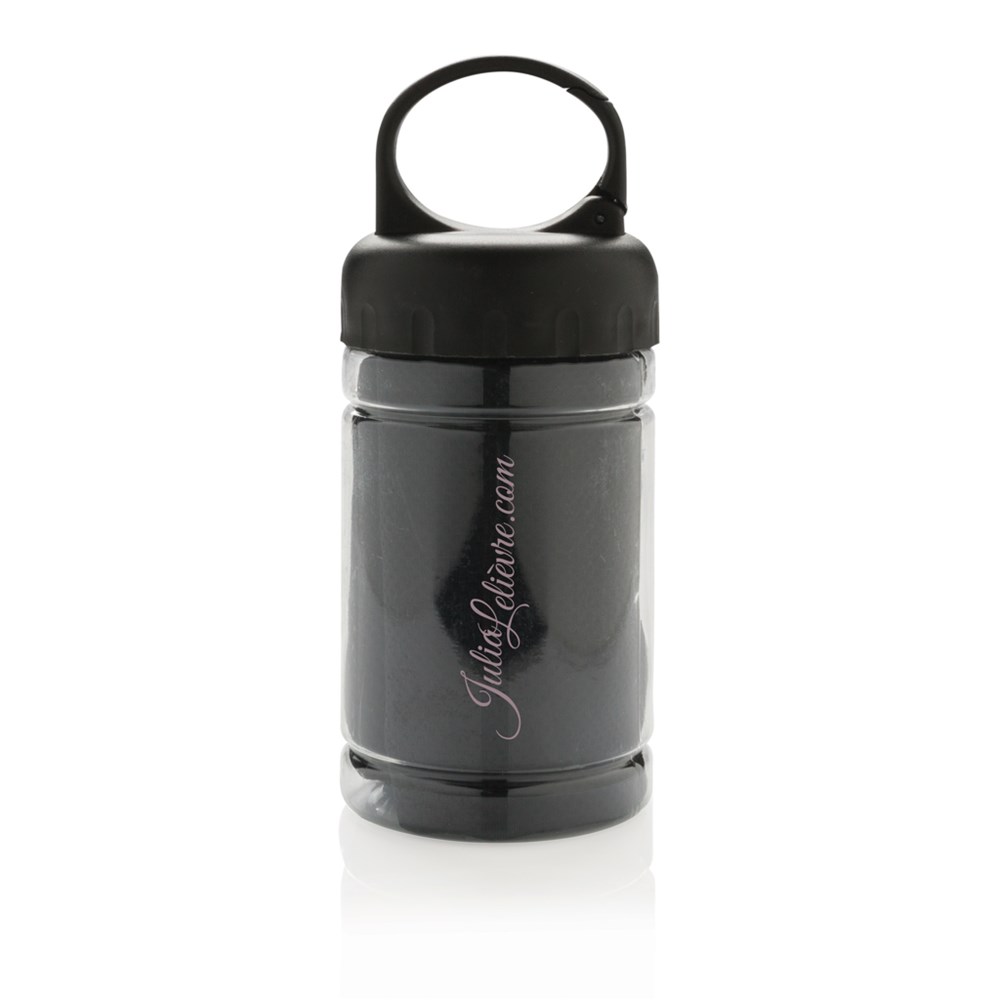 Mikrofaser Kühlhandtuch ( ca. 77x30cm) mit 98% Sun-Blocker-Funktion bis zu UV50+. Einfach etwas kühles Wasser zum Handtuch in die Dose geben und fertig ist die Erfrischung. Die Dose aus PP, der Deckel aus ABS und das ganze mit einem Karabiner, um sie bei allen Outdoor-Aktivitäten immer dabei zu haben.
