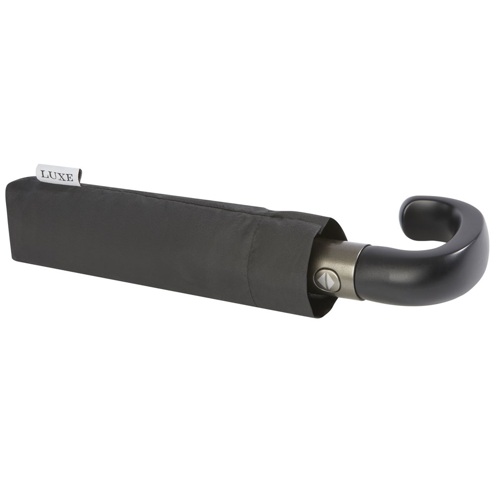 Vollautomatik Kompaktregenschirm mit einem Polyesterschirm aus Pongee Polyester. Robuster Metallschaft und hochwertiger Rahmen mit Glasfaserrippen bieten maximale Flexibilität bei windigem Wetter. Wird mit einem Beutel geliefert und passt für den bequemen Transport problemlos in eine Handtasche oder einen Rucksack. Weicher, gebogener Griff mit Details aus gebürstetem Edelstahl und schwarz vernickelten Spitzen. Luxe Markendetails auf dem gewebten Etikett auf Baldachin, Tasche und Verschlussriemen. Große Dekorationsfläche auf jedem Paneel.