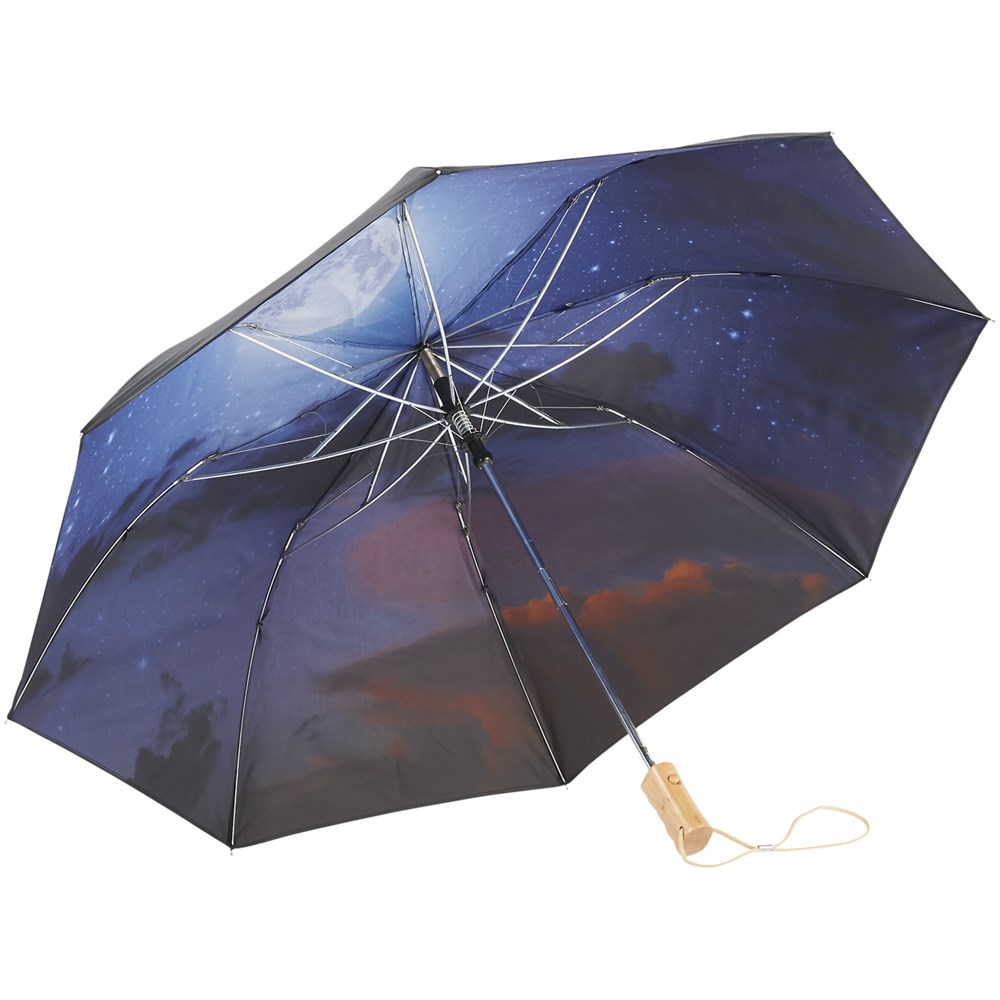 Der 21-Zoll-Regenschirm kann zweimal zusammengeklappt werden und er kommt mit einer doppellagigen Polyester-Beschirmung, mit einem Innenkosmos und einem hellen Monddesign. Bequeme automatische Öffnungsfunktion. Metall-Schaft und -Stangen. Holzgriff mit Handgelenkschlaufe. Inklusive einer Aufbewahrungstasche. 42 cm wenn zusammengeklappt.