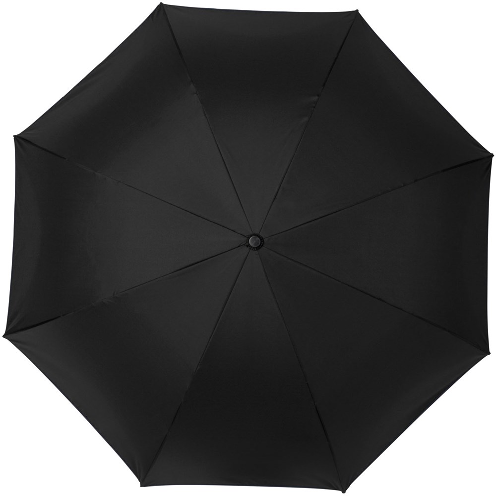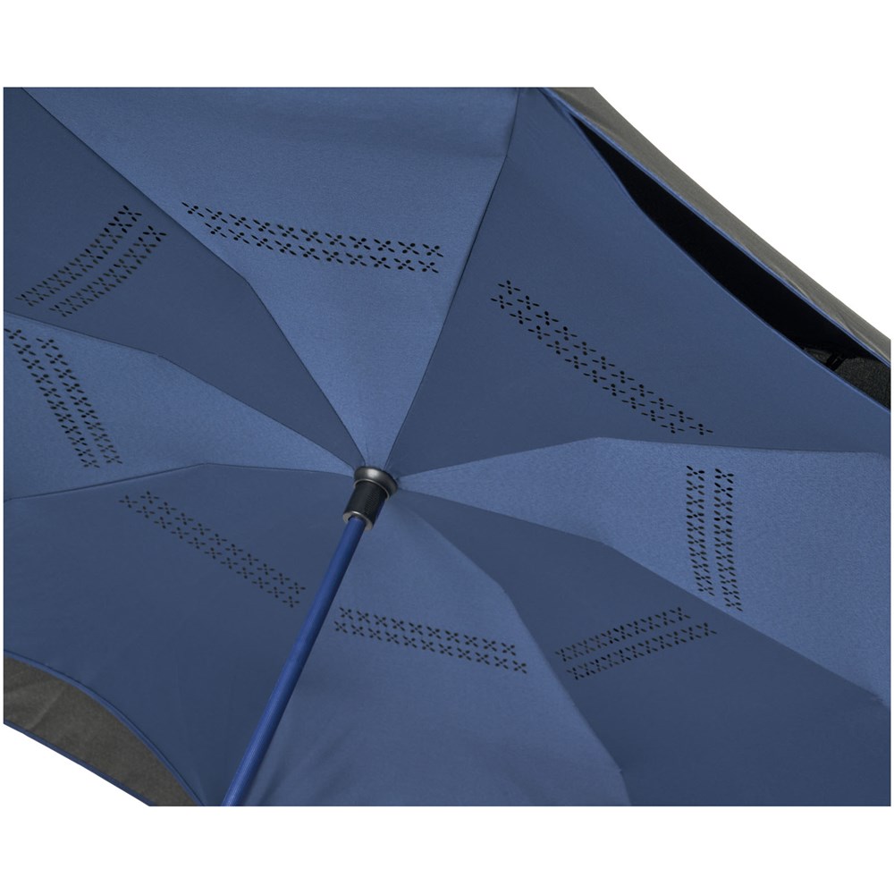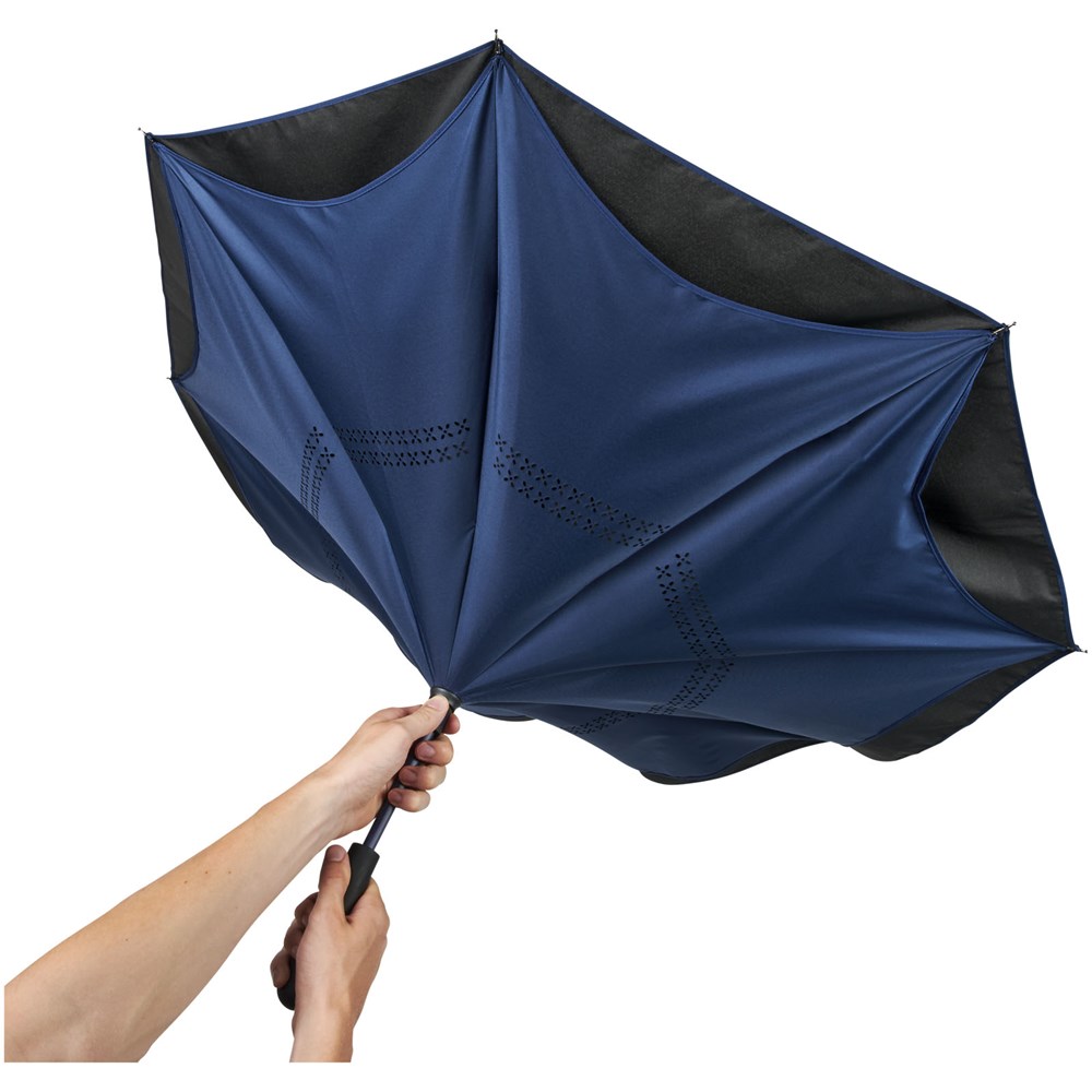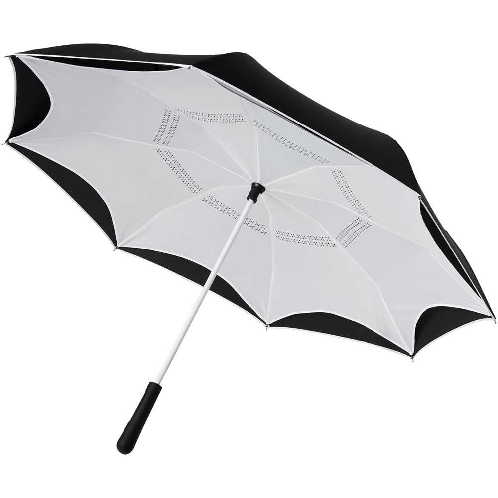 23 Zoll zusammenklappbarer Wende-Regenschirm in frischen Farben. Öffnet und schließt „verkehrt herum“, dies macht es einfacher, ihn beim Ein- und Aussteigen in ein Auto zu verwenden, da das Wasser innen und die äußere Oberfläche trocken bleibt. Der Regenschirm kann alleine stehen, wenn er geschlossen ist, sodass das Wasser zum Trocknen ablaufen kann. Windfestes Gestell mit Fiberglas-Speichen und Schaft. Manuelle Öffnung mit einem Druckknopf, einklemmsicherer Schieber und doppellagige Polyester-Plane. Die innere Haube und die Paspelierung auf der äußeren Haube sind farblich abgestimmt, sowohl mit dem Glasfaserschaft als auch mit dem Druckknopf. Große Dekorationsfläche auf jedem Paneel verfügbar.
