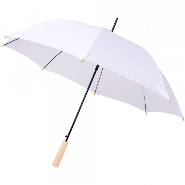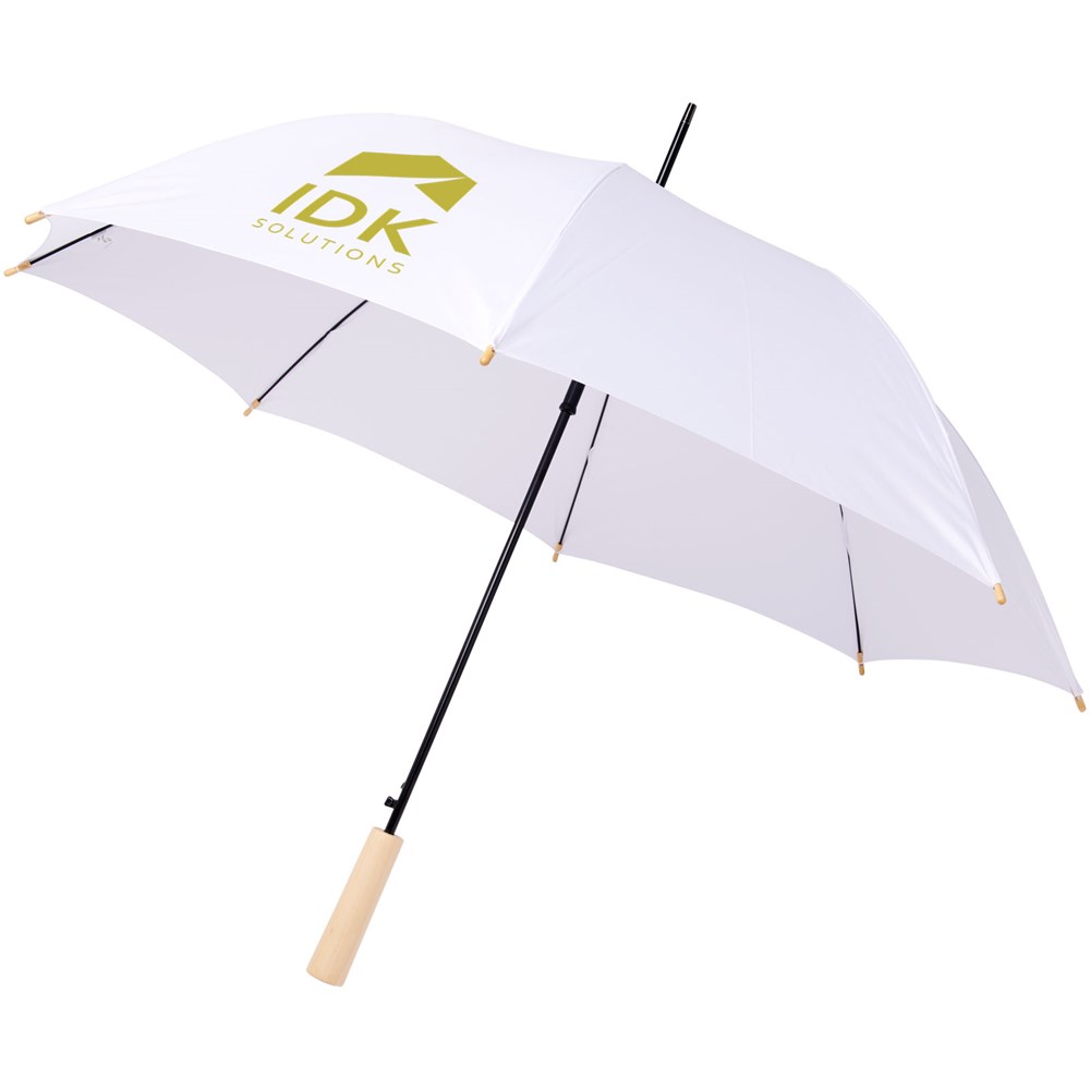 Automatikregenschirm mit Schirm aus recyceltem PET-Pongee-Polyester. Robuster Metallschaft und ein hochwertiger Rahmen mit Glasfaserrippen, der Flexibilität bei Wind bietet. Zusammen mit dem Holzgriff, den Spitzen und dem Schirm aus recyceltem PET-Pongee-Polyester bietet er eine nachhaltige Wahl. Erhältlich in vielen verschiedenen modernen Farben mit einer großen Dekorationsfläche auf jedem Paneel, der Holzgriff kann ebenfalls dekoriert werden.