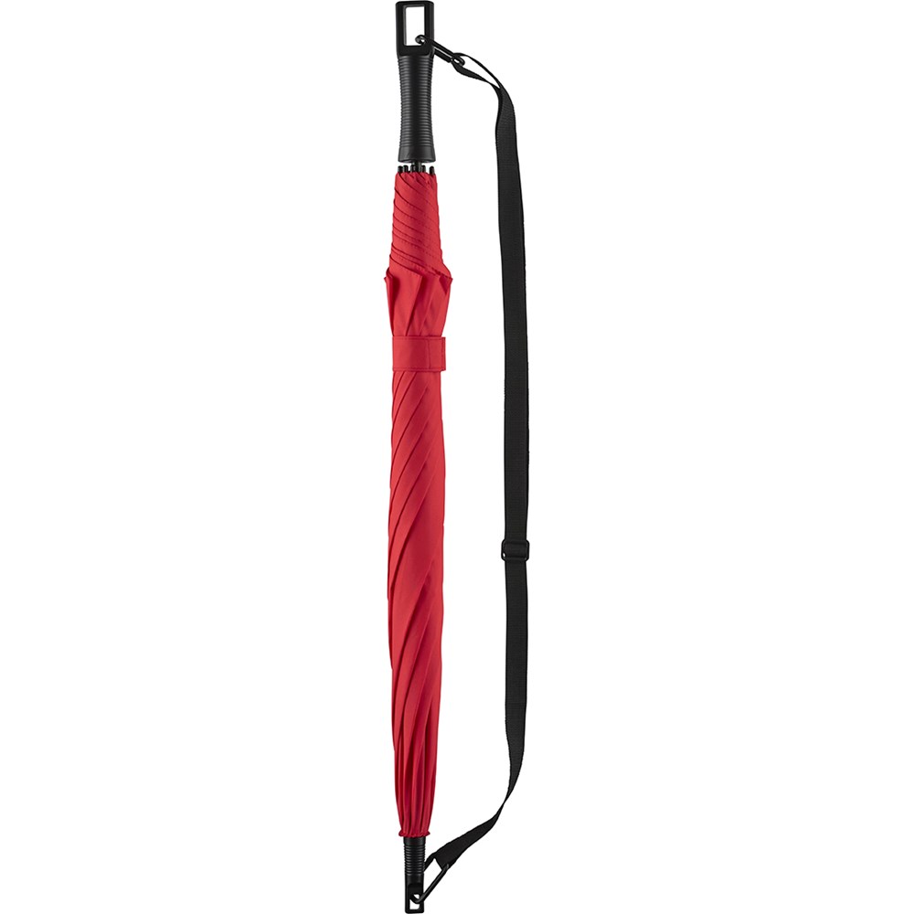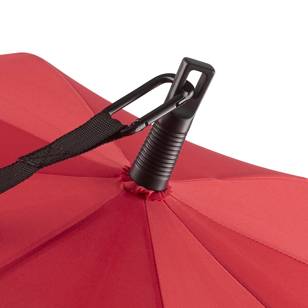 Komfortable Automatik-Funktion zum schnellen Öffnen, Windproof-Features für höhere Gestell-Flexibilität und bessere Windsicherheit, matt-schwarzer gerader Kunststoffgriff mit Werbeanbringungsmöglichkeit, schwarzer Tragegurt mit Karabinerhaken zum Umhängen, höherer Korrosionsschutz durch schwarze Galvanisierung des Stahlstocks