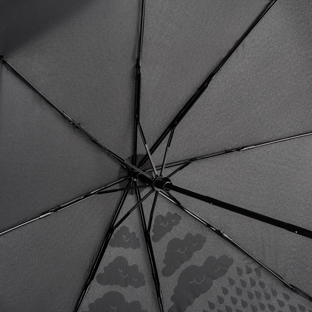 Einfache Handhabung durch Sicherheitsschieber, Windproof-Features für höhere Gestell-Flexibilität und bessere Windsicherheit, Bezug mit Spezialdruck auf zwei Keilen (weißes Regenwolken-Motiv bei Trockenheit sichtbar, farbiger Regenbogen-Unterdruck bei Nässe sichtbar), Soft-Touch-Griff mit Werbeanbringungsmöglichkeit. Auch als Stockschirm (Art. 1142C) erhältlich.