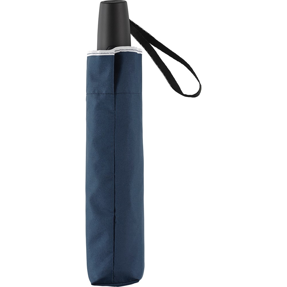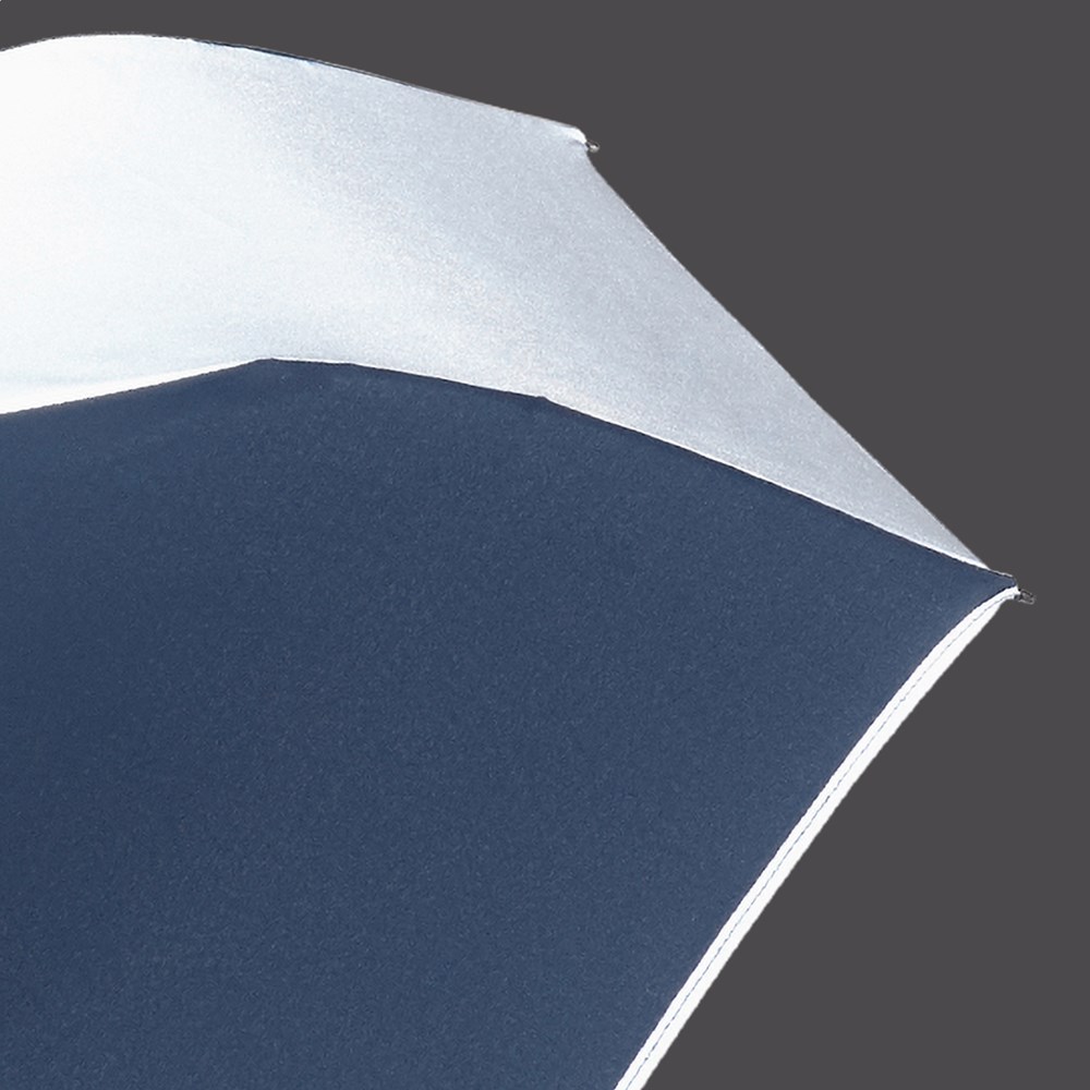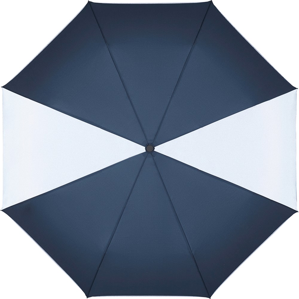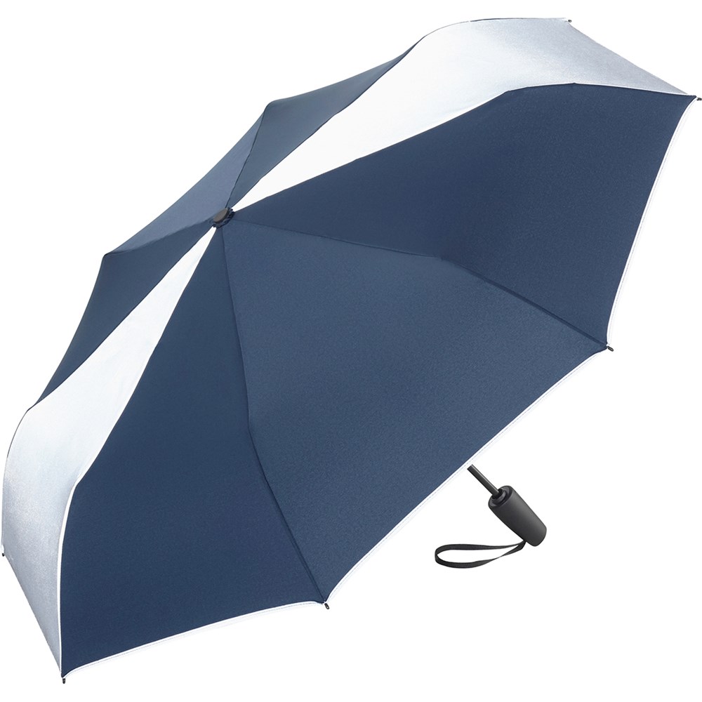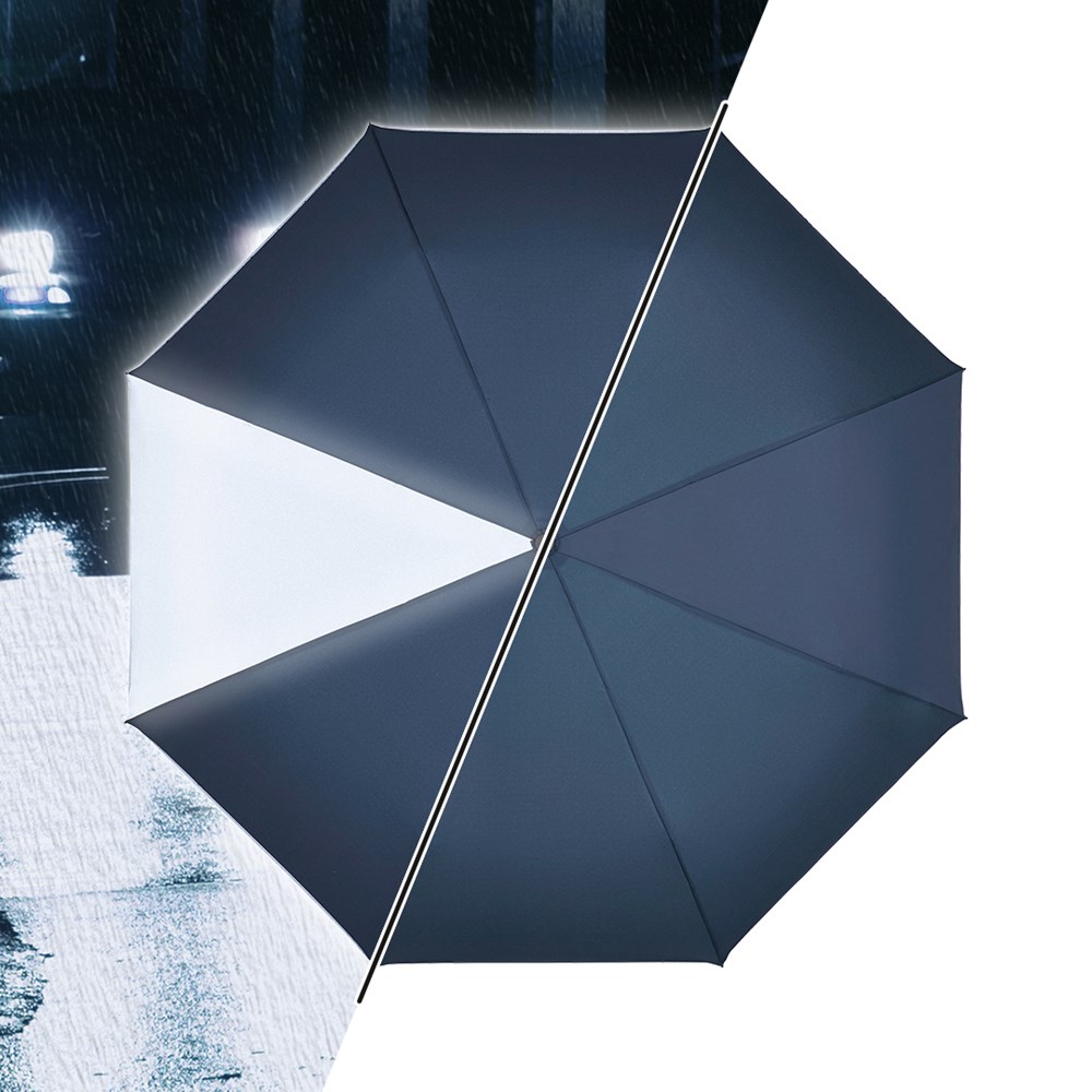 Trendiger Doppelautomatik-Taschenschirm mit reflektierender Außenbeschichtung auf zwei Keilen.