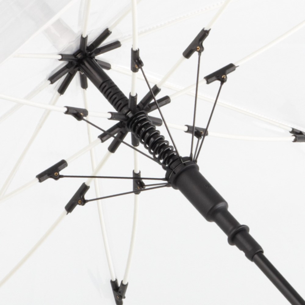 Ansprechender Automatik-Stockschirm mit transparentem Bezug und farbigen Details.