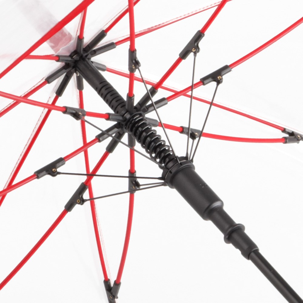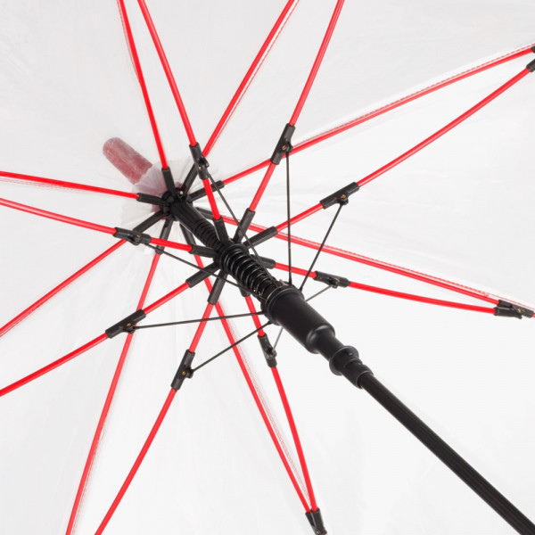 Ansprechender Automatik-Stockschirm mit transparentem Bezug und farbigen Details.