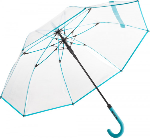 Ansprechender Automatik-Stockschirm mit transparentem Bezug und farbigen Details. Komfortable Automatik-Funktion zum schnellen Öffnen, hochwertiges Windproof-System für eine maximale Gestell-Flexibilität bei stärkeren Windböen, flexible Fiberglasschienen, farblich aufeinander abgestimmte Design-Elemente, handsympathischer Soft-Touch-Rundhakengriff mit integrierter Auslösetaste und Werbeanbringungsmöglichkeit, höherer Korrosionsschutz durch schwarze Galvanisierung des Stahlstocks Produktinformation: Schirm-Durchmesser: 105 cm Geschlossene Länge: 87 cm Keilanzahl: 8 Gewicht: 495 g Stock-Durchmesser: 10 mm Features: AC (automatisch öffnend) Windproof-System Fibertec EXCLUSIVE FARE®