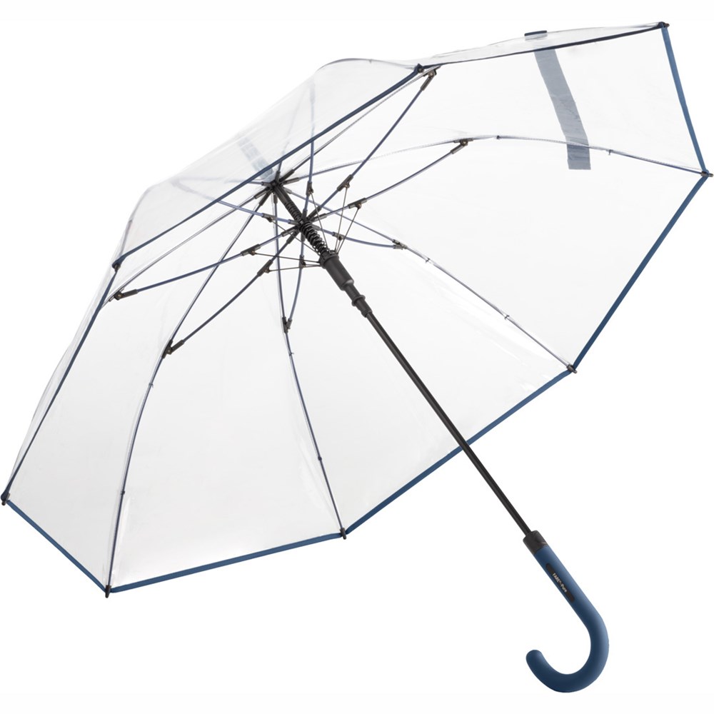 Ansprechender Automatik-Stockschirm mit transparentem Bezug und farbigen Details.