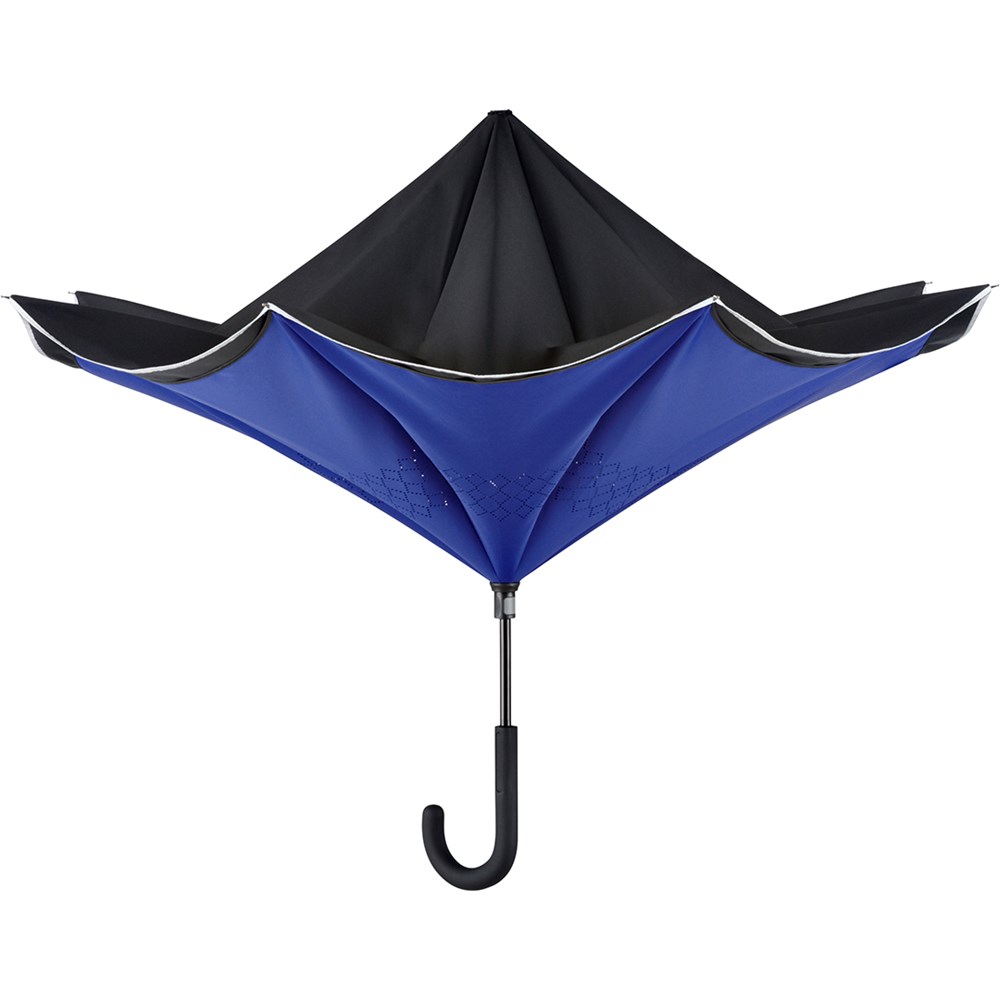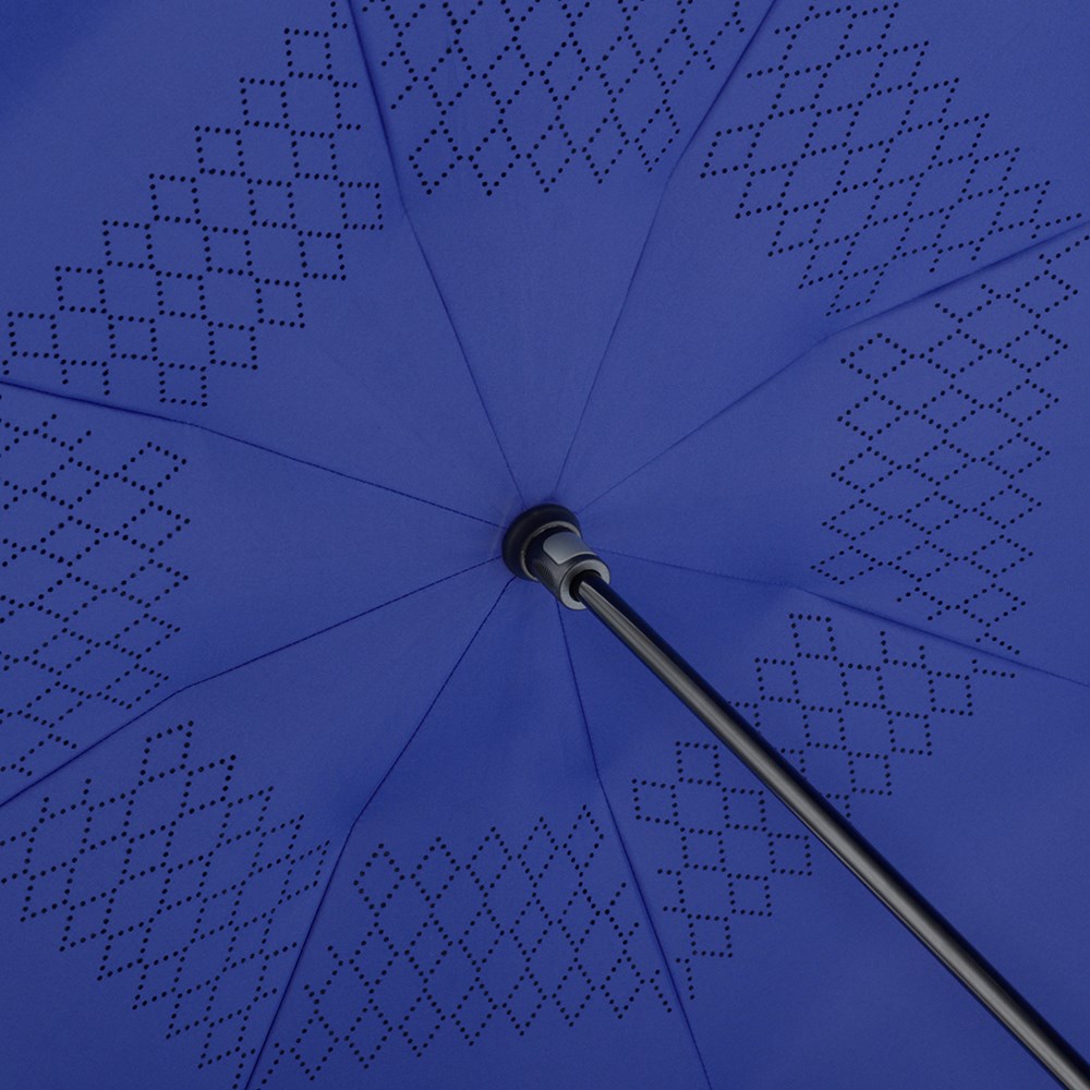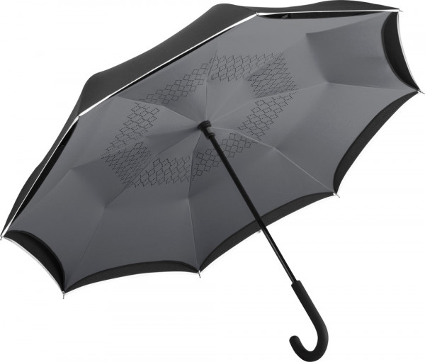 Trendiger Stockschirm mit umgekehrtem Öffnungs- und Schließmechanismus. Einfache Handhabung durch Sicherheitsschieber, hochwertiges Windproof-System für eine maximale Gestell-Flexibilität bei stärkeren Windböen, von innen nach außen öffnendes Fiberglasgestell, flexible Fiberglasschienen, Doppel-Bezug mit gelasertem Ventilationsmuster zur Vermeidung von Luftstau, Bezug mit modischer Reflexpaspel in silber, Soft-Touch-Rundhakengriff mit Werbeanbringungsmöglichkeit. Auch als Taschenschirm erhältlich (Art. 5415). Produktinformation: Schirm-Durchmesser: 109 cm Geschlossene Länge: 78 cm Keilanzahl: 8 Gewicht: 495 g Stock-Durchmesser: 12 mm Features: Windproof-System Fibertec Modische Reflexpaspel