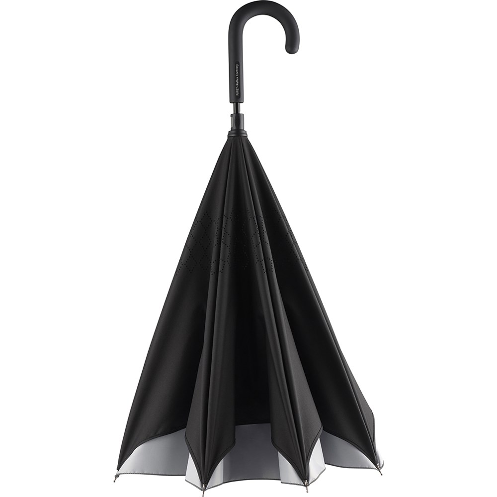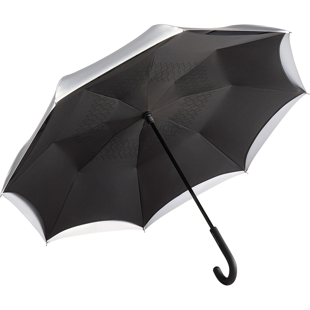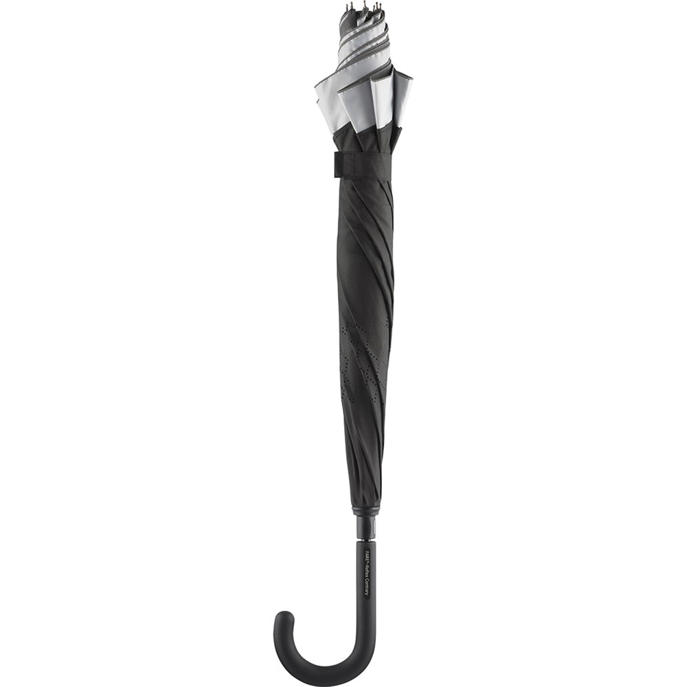 Besonderer Stockschirm mit umgekehrtem Öffnungs- und Schließmechanismus und modisch reflektierender Außenbeschichtung. Einfache Handhabung durch Sicherheitsschieber, hochwertiges Windproof-System für eine maximale Gestell-Flexibilität bei stärkeren Windböen, von innen nach außen öffnendes Fiberglasgestell, flexible Fiberglasschienen, Doppel-Bezug mit gelasertem Ventilationsmuster zur Vermeidung von Luftstau, modisch reflektierender Außenbezug, Soft-Touch-Rundhakengriff mit Werbeanbringungsmöglichkeit Produktinformation: Schirm-Durchmesser: 109 cm Geschlossene Länge: 78 cm Keilanzahl: 8 Gewicht: 615 g Stock-Durchmesser: 12 mm Features: Windproof-System Fibertec Reflektierender Bezug