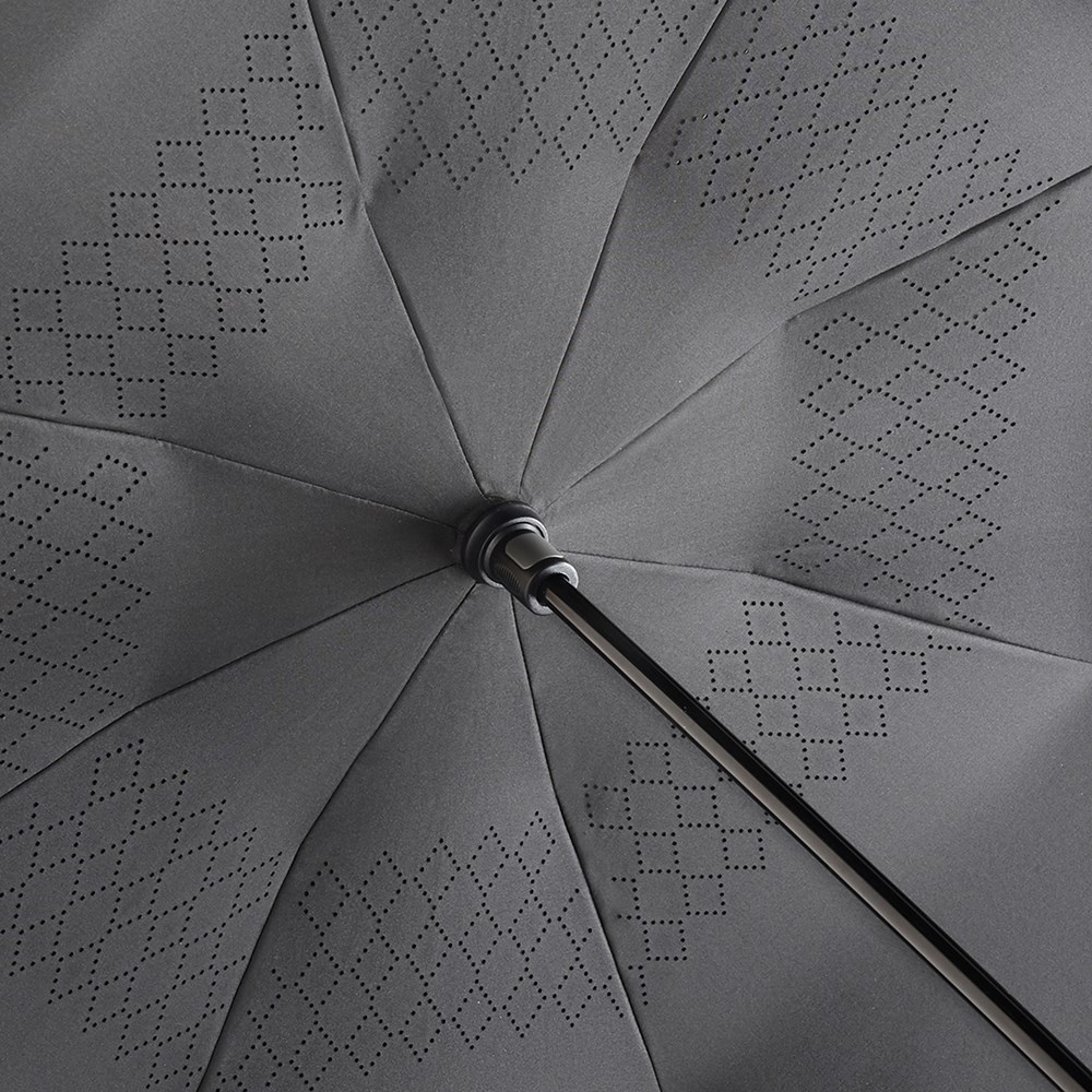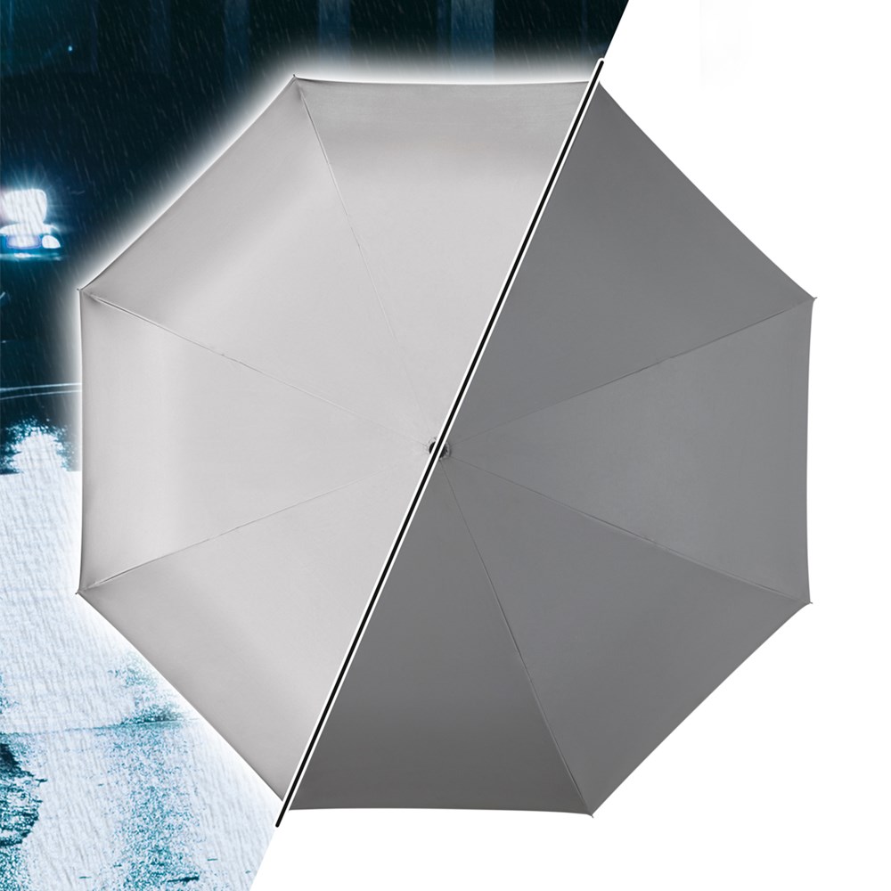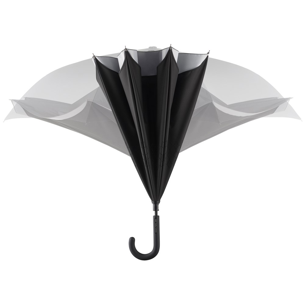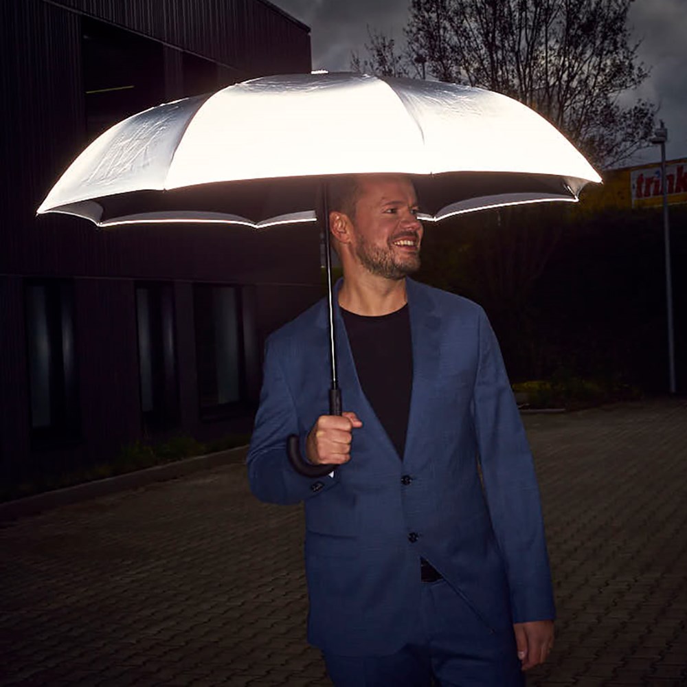 Besonderer Stockschirm mit umgekehrtem Öffnungs- und Schließmechanismus und modisch reflektierender Außenbeschichtung. Einfache Handhabung durch Sicherheitsschieber, hochwertiges Windproof-System für eine maximale Gestell-Flexibilität bei stärkeren Windböen, von innen nach außen öffnendes Fiberglasgestell, flexible Fiberglasschienen, Doppel-Bezug mit gelasertem Ventilationsmuster zur Vermeidung von Luftstau, modisch reflektierender Außenbezug, Soft-Touch-Rundhakengriff mit Werbeanbringungsmöglichkeit Produktinformation: Schirm-Durchmesser: 109 cm Geschlossene Länge: 78 cm Keilanzahl: 8 Gewicht: 615 g Stock-Durchmesser: 12 mm Features: Windproof-System Fibertec Reflektierender Bezug