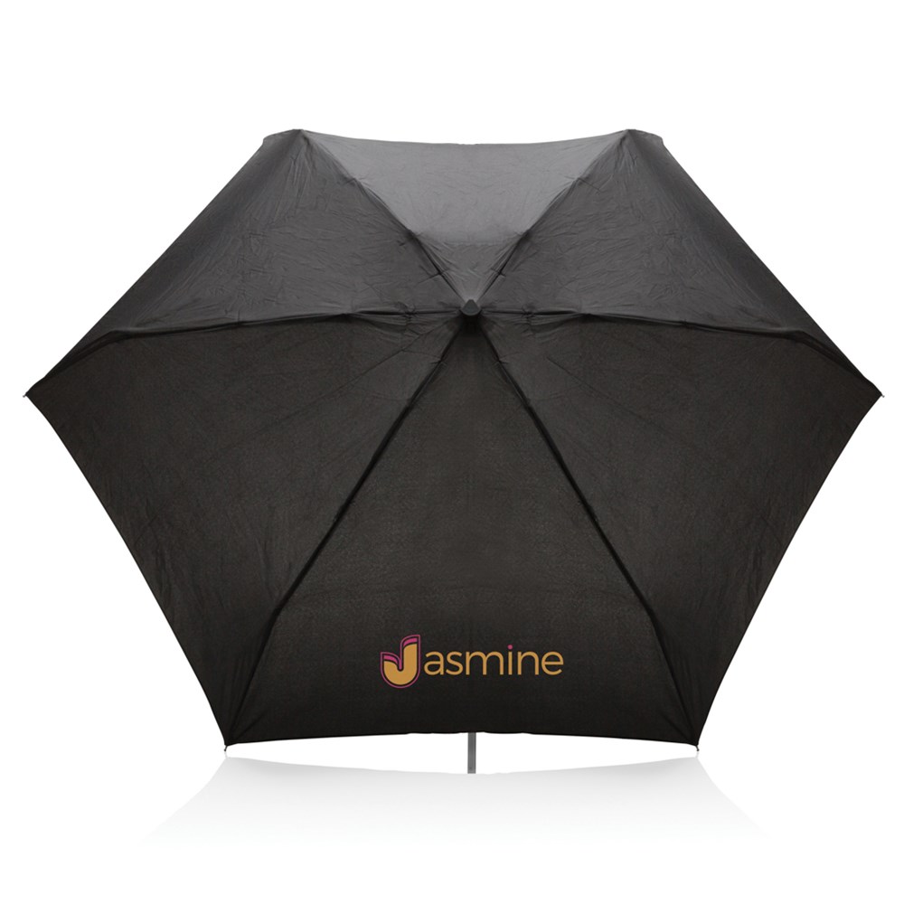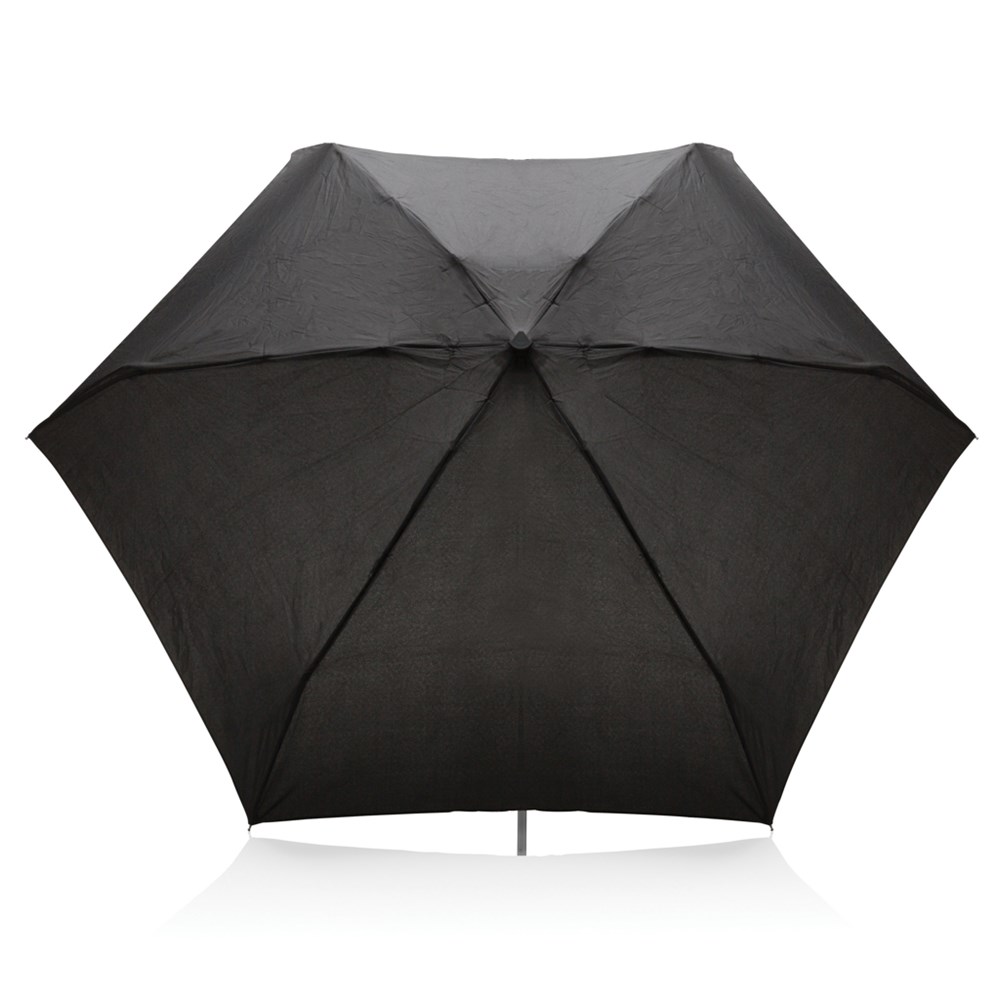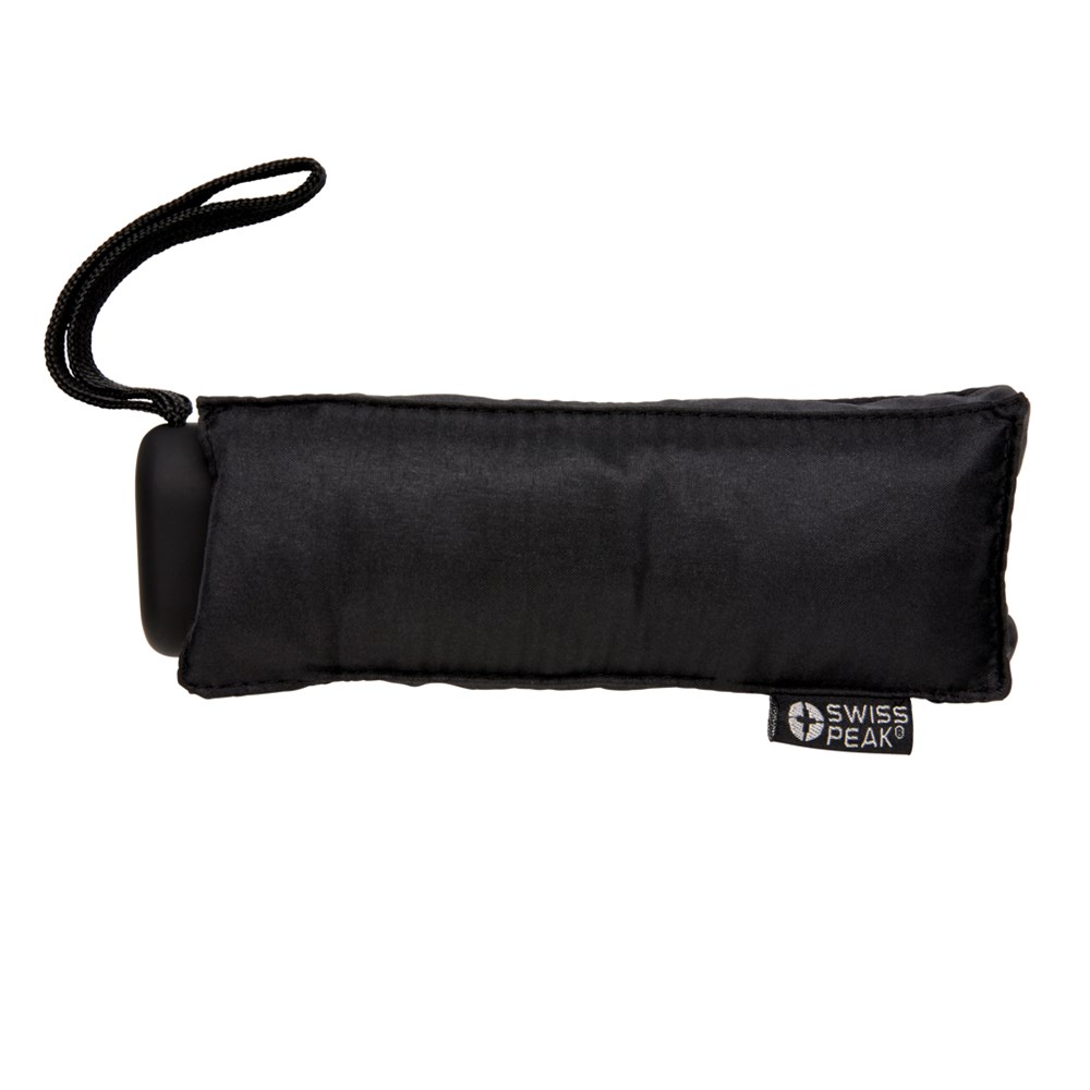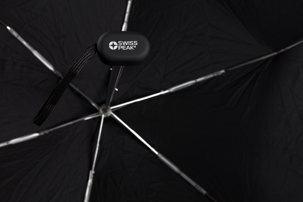 Taschenschirm aus 190T Pongee Polyster mit manueller Öffnung. Metallrahmen und Fiberglasrippen. Flacher Gummigriff. Verpackt im Swiss Peak Etui.